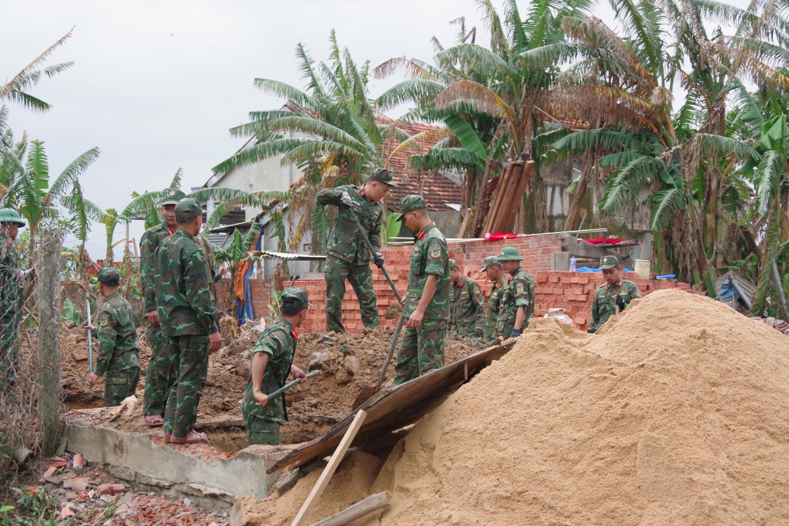 Cán bộ, chiến sĩ Trung đoàn Pháo binh 4 xây dựng lại nhà ở cho người dân. Ảnh: qdnd.vn