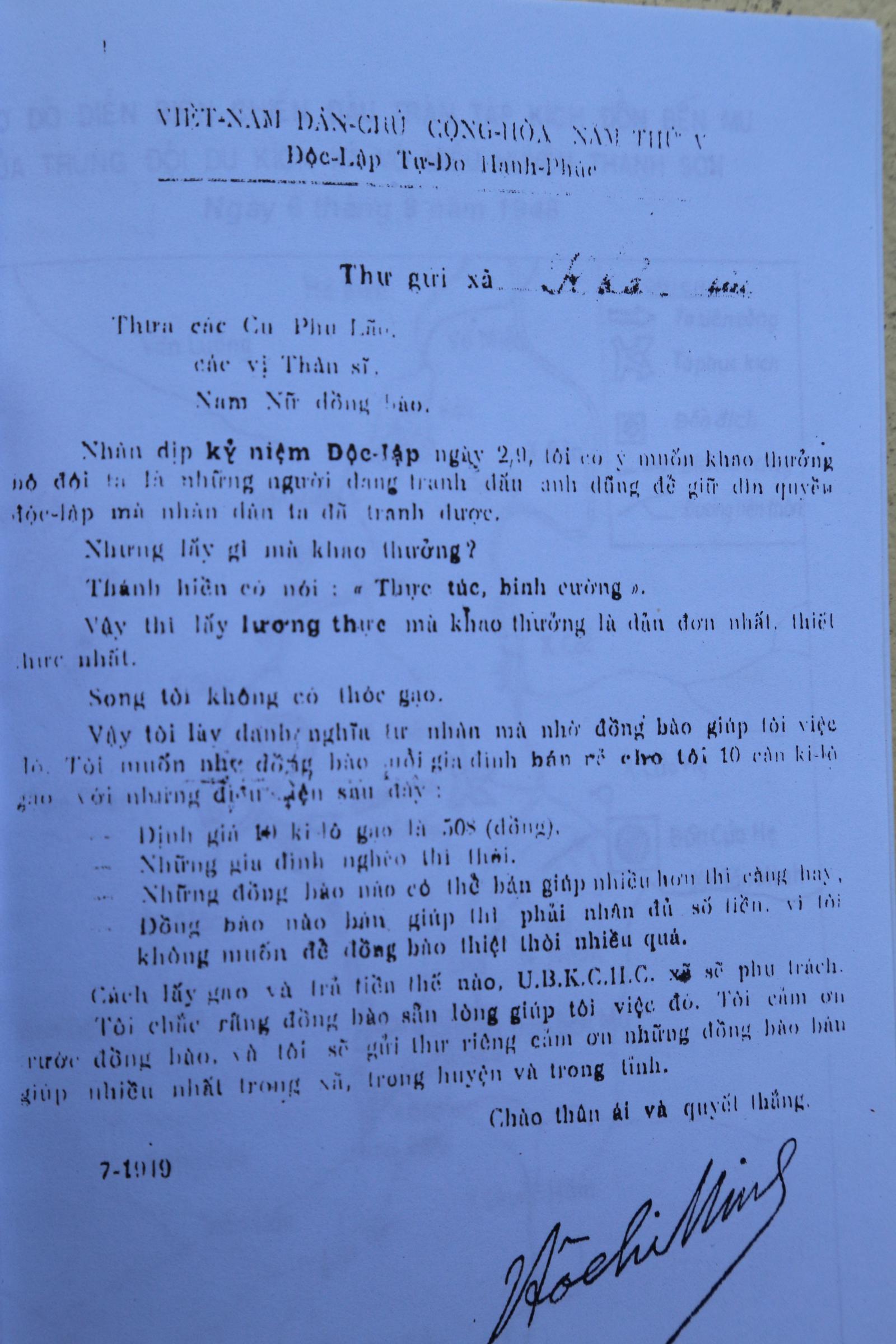 Người viết: “Thư gửi xã Khả Cửu. Thưa các cụ phụ lão, các vị thân sỹ, nam nữ đồng bào. Nhân dịp kỷ niệm Độc lập - ngày 2/9, tôi có ý muốn khao thưởng bộ đội ta là những người đang tranh đấu anh dũng để giữ gìn quyền độc lập mà nhân dân ta đã tranh được. Nhưng lấy gì mà khao thưởng? Thánh hiền có nói: “Thực túc, binh cường”. Vậy thì lấy lương thực mà khao thưởng là giản đơn nhất, thiết thực nhất. Song tôi không có thóc gạo. Vậy tôi lấy danh nghĩa tư nhân mà nhờ đồng bào giúp tôi việc đó. Tôi muốn nhờ đồng bào mỗi gia đình bán rẻ cho tôi 10 cân (ki-lô) gạo với những điều kiện sau đây: Định giá 10 ki-lô gạo là 50$ (đồng). Những gia đình nghèo thì thôi. Những đồng bào nào có thể bán giúp nhiều hơn thì càng hay. Đồng bào nào bán giúp thì phải nhận đủ số tiền, vì tôi không muốn để đồng bào thiệt thòi nhiều quá. Cách lấy gạo và trả tiền thế nào, Ủy ban Kháng chiến Hành chính xã sẽ phụ trách. Tôi chắc rằng đồng bào sẵn lòng giúp tôi việc đó. Tôi cảm ơn trước đồng bào, và tôi sẽ gửi thư riêng cảm ơn các đồng bào bán giúp nhiều nhất trong xã, trong huyện và trong tỉnh. Chào thân ái và quyết thắng. Hồ Chí Minh”.