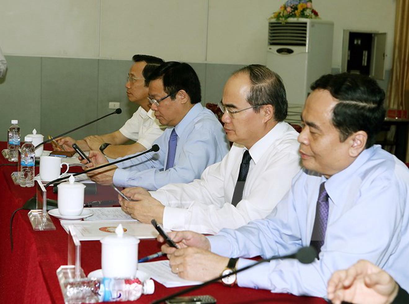 Chủ tịch Nguyễn Thiện Nhân, Phó Thủ tướng Vương Đình Huệ cùng các vị đại biểu tại Lễ phát động cùng lúc nhắn tin, hưởng ứng tháng cao điểm Vì người nghèo năm 2016. (Ảnh: Nguyễn Dân/TTXVN)