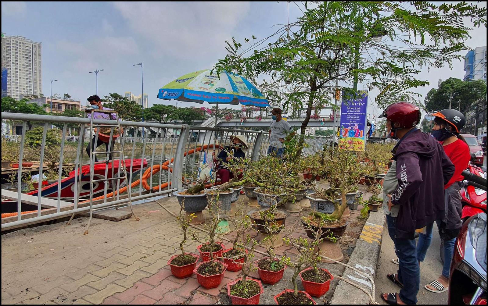 Theo ghi nhận của PV Báo Thanh tra, chiều ngày 5/2/2021 (tức 24 tháng Chạp), dọc đường Bến Bình Đông hàng chục thuyền gỗ cỡ lớn đã cập bến để chuyển cây cảnh xuống bán. Các nhà vườn cho biết, năm nay mang hoa xuống sớm để bán phục vụ Tết, thậm chí có những ghe chở hoa kiểng bonsai mini còn cập bến từ ngày 19 tháng Chạp…