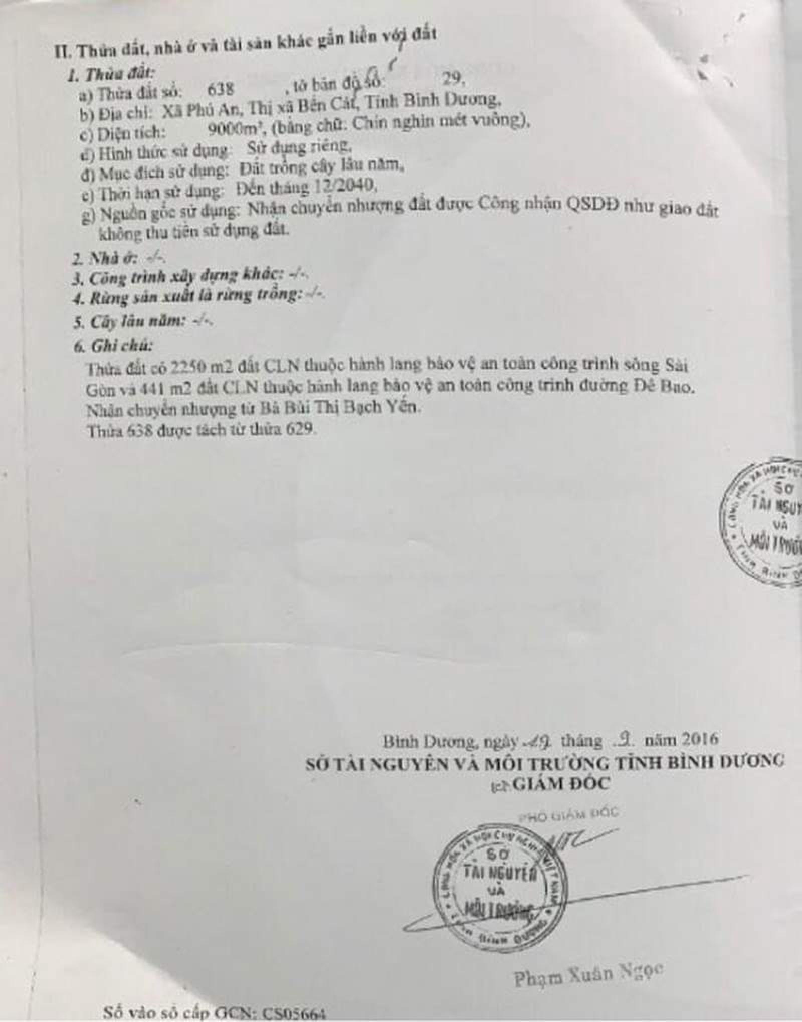 Hơn một tháng sau, ngày 19/9/2016, bà H được cấp Sổ đỏ số CĐ689694, số vào sổ cấp giấy chứng nhận: CS05664, toàn bộ diện tích 9.000m2 được ghi mục đích sử dụng: Trồng cây lâu năm; thời hạn sử dụng: Đến tháng 12/2040.