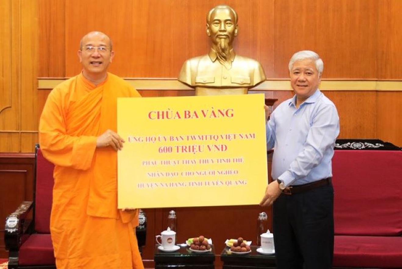 (Thanh tra) - Chiều 7/7, Chủ tịch Ủy ban Trung ương Mặt trận Tổ quốc (UBTƯ MTTQ) Việt Nam Đỗ Văn Chiến đã tiếp nhận số tiền 600 triệu đồng từ Chùa Ba Vàng để góp thêm nguồn lực hỗ trợ phẫu thuật thay thủy tinh thể nhân đạo cho người nghèo trên địa bàn huyện Na Hang, tỉnh Tuyên Quang.
