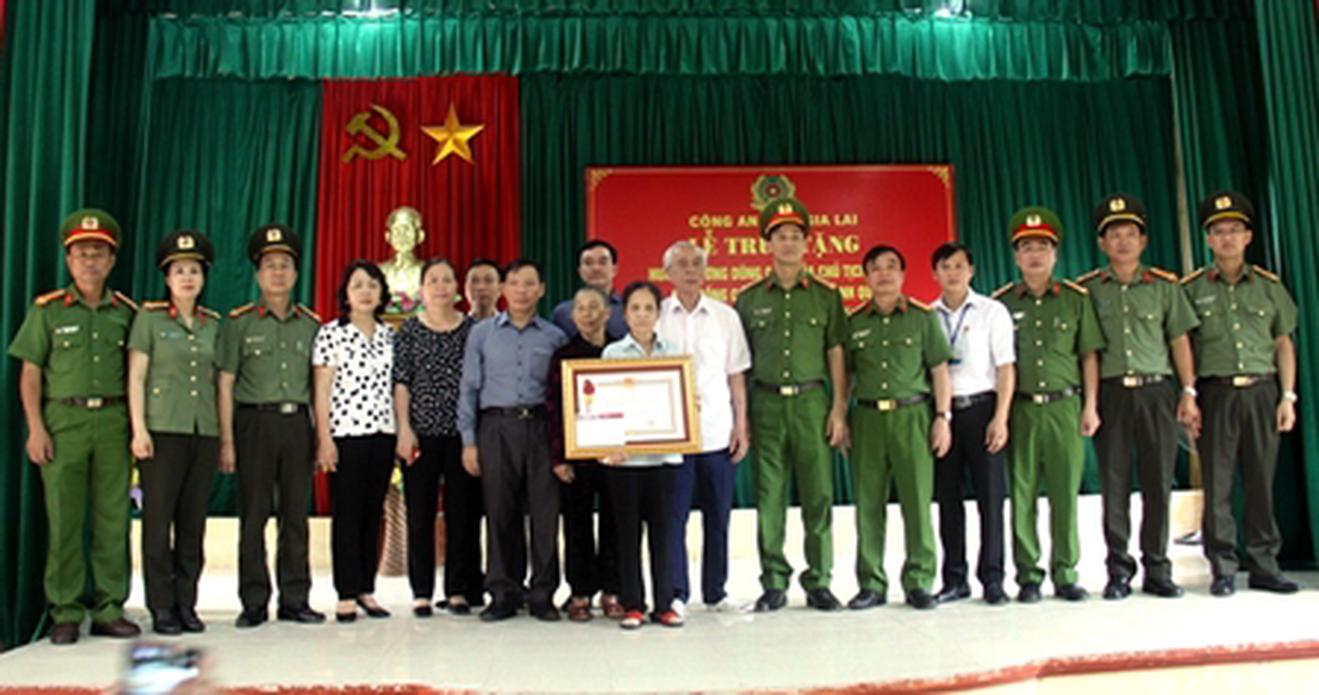 Công an Gia Lai thừa ủy quyền của Chủ tịch nước trao tặng Huân chương Dũng cảm cho gia đình Thiếu úy Bùi Minh Quý. Ảnh: Lương Ý