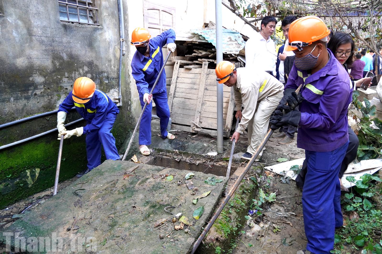 Các công nhân đang bật nắp cống thoát nước lên để kiểm tra. Ảnh: Hoàng Long