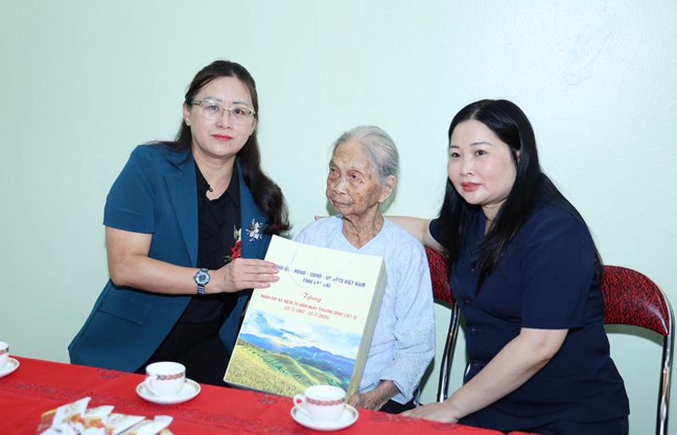 Bà Giàng Thị Dung, Phó Bí thư Tỉnh ủy, Chủ tịch Ủy ban MTTQ Việt Nam tỉnh Lào Cai và đồng chí Vũ Thị Hiền Hạnh, Phó Chủ tịch UBND tỉnh tặng quà Mẹ Việt Nam anh hùng Nguyễn Thị Hòa. Ảnh: MTTQ