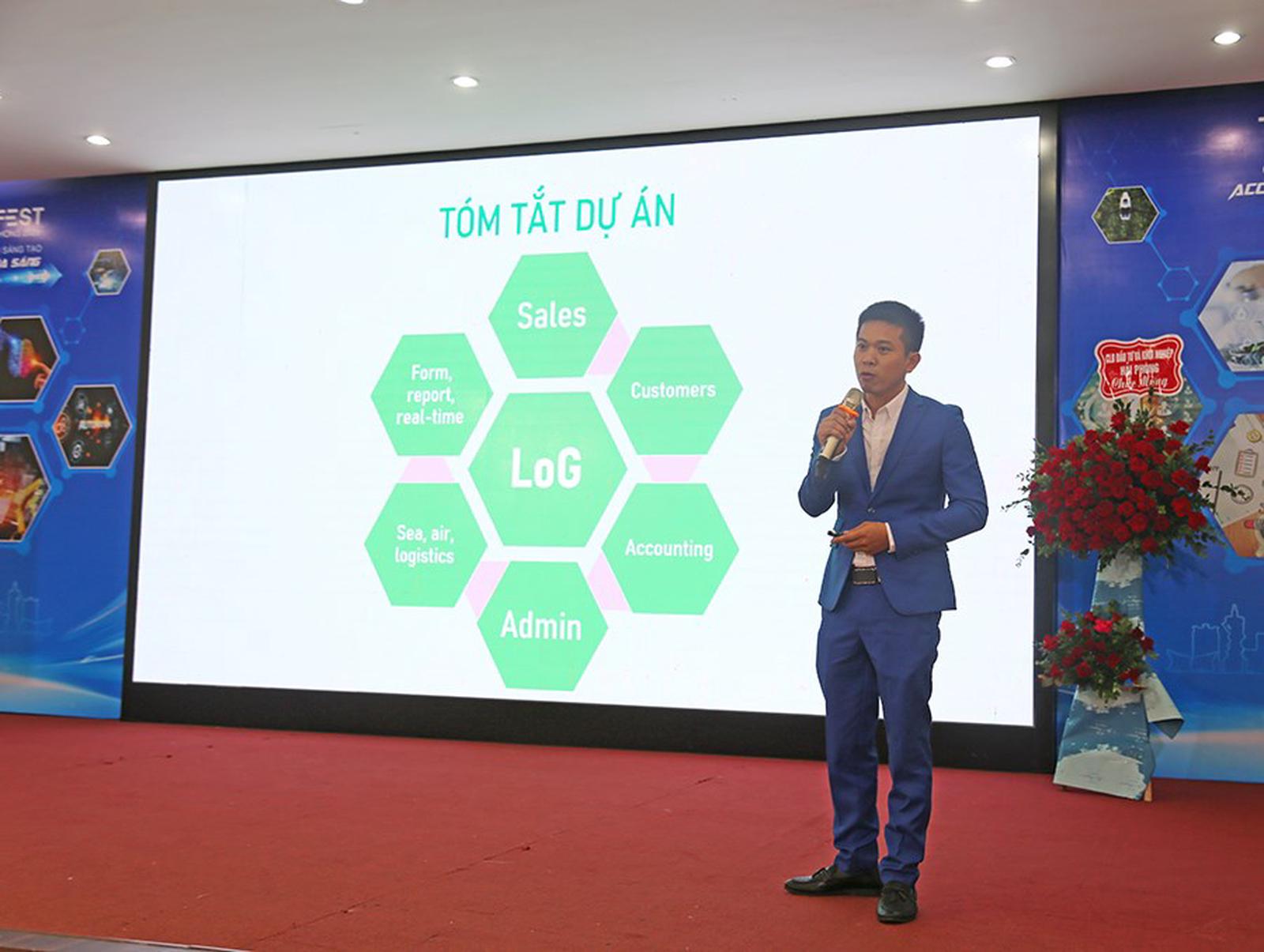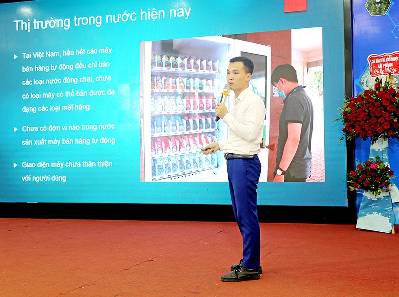 Đại diện Dự án Robot bán hàng robotshop thuyết trình tại cuộc thi. Ảnh: KT