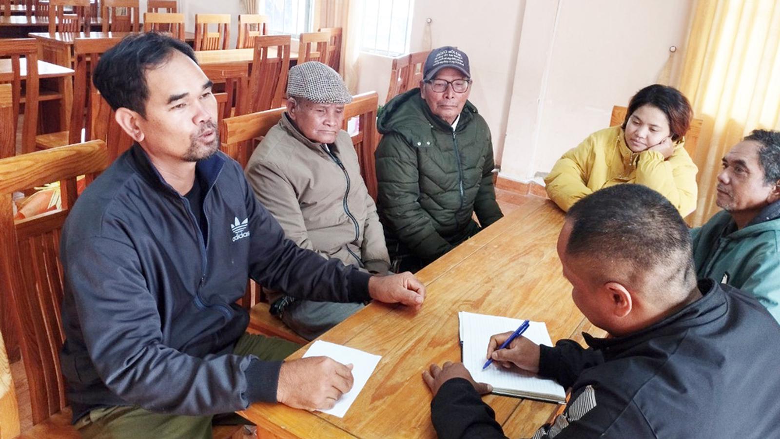 Ông K’Biel (ngoài cùng bên trái) thực hiện việc tuyên truyền, vận động pháp luật đến bà con Nhân dân Thôn 1. Ảnh minh họa: Báo Lâm Đồng