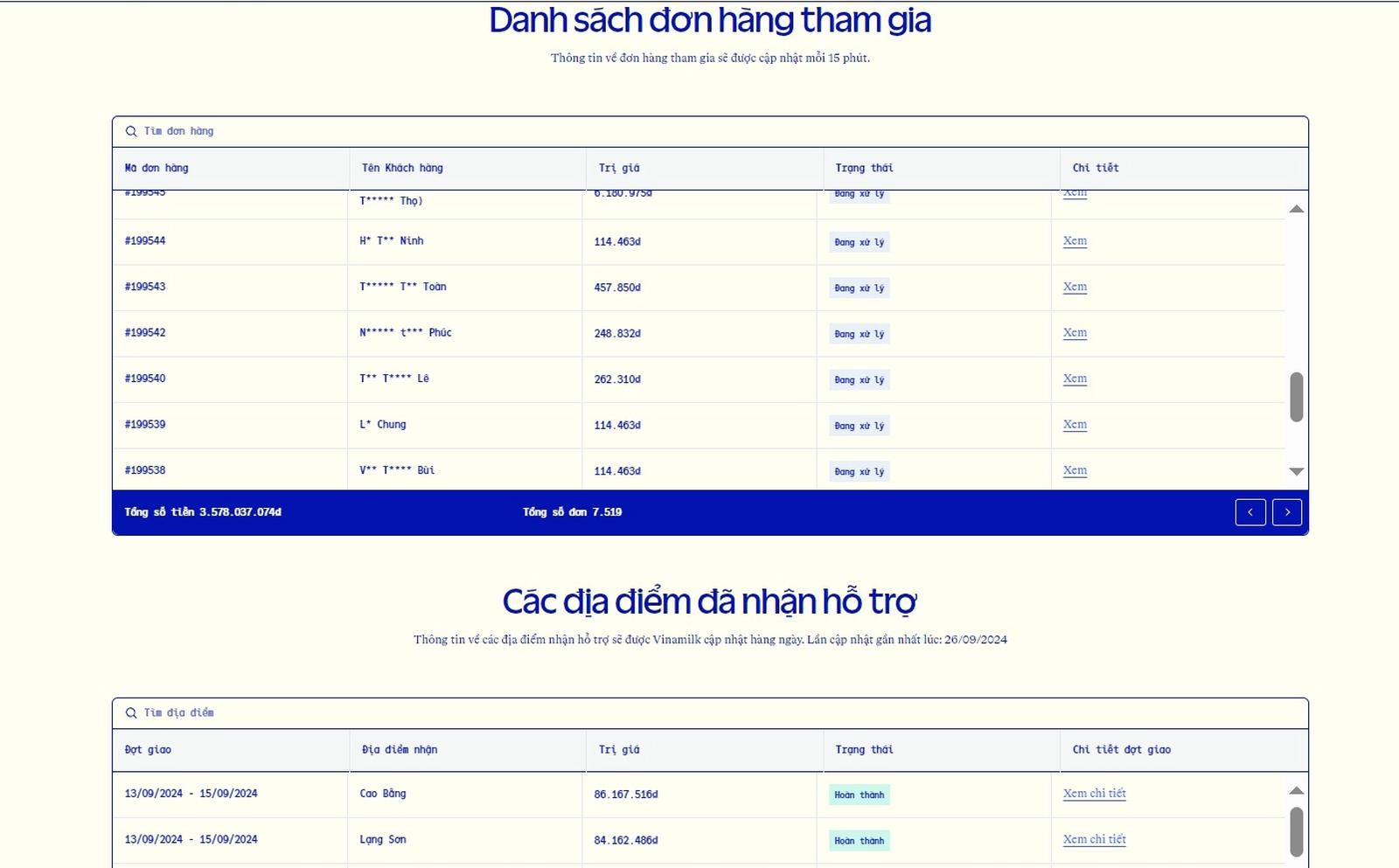 Vinamilk công khai thông tin đơn hàng hỗ trợ đồng bào bị ảnh hưởng bão lũ cùng số lượng, địa điểm cụ thể trên website