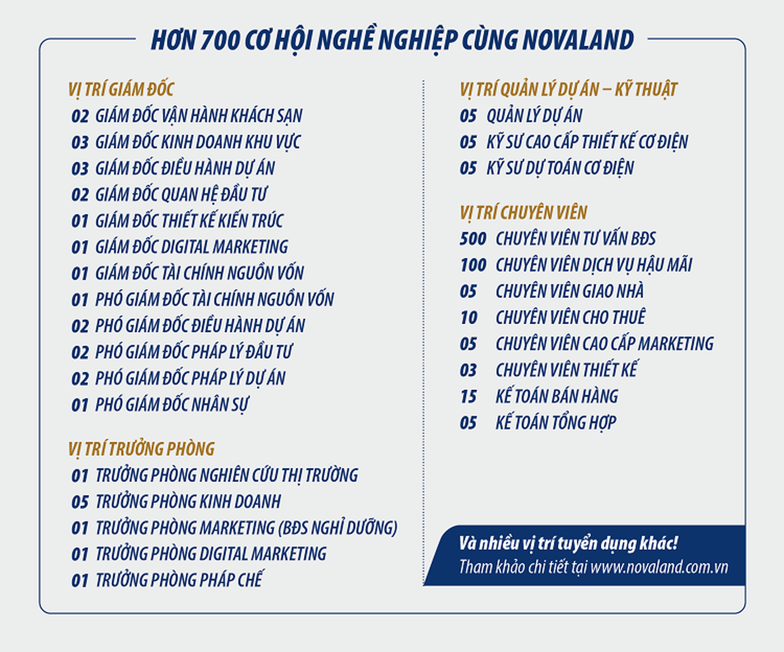 Là công ty niêm yết có vốn hóa cao trong VN30, Tập đoàn Novaland có cổ đông chiến lược quốc tế cùng đồng hành lâu dài và được nhiều tổ chức tài chính nước ngoài đánh giá cao. Phục vụ chiến lược mở rộng phát triển mảng BĐS nghỉ dưỡng, Novaland giới thiệu hơn 700 cơ hội nghề nghiệp cho nhân tài ngành BĐS tại một loạt thành phố lớn như TP.HCM, Vũng Tàu, Nha Trang, Phú Quốc, Cần Thơ…