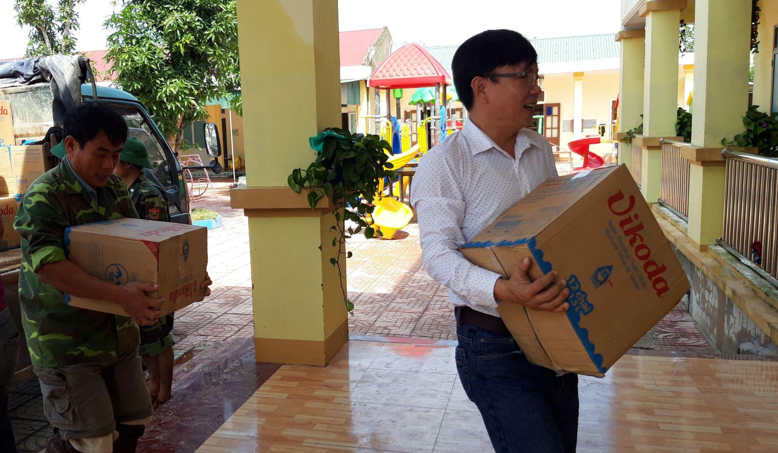 Nhà báo Nguyễn Xuân Hoàng cùng các thành viên đoàn cứu trợ và Bộ đội Biên phòng Hà Tĩnh mang hàng hóa, nhu yếu phẩm đến với bà con bị thiệt hại tại xã Cẩm Duệ - Ảnh: Chu Mùi