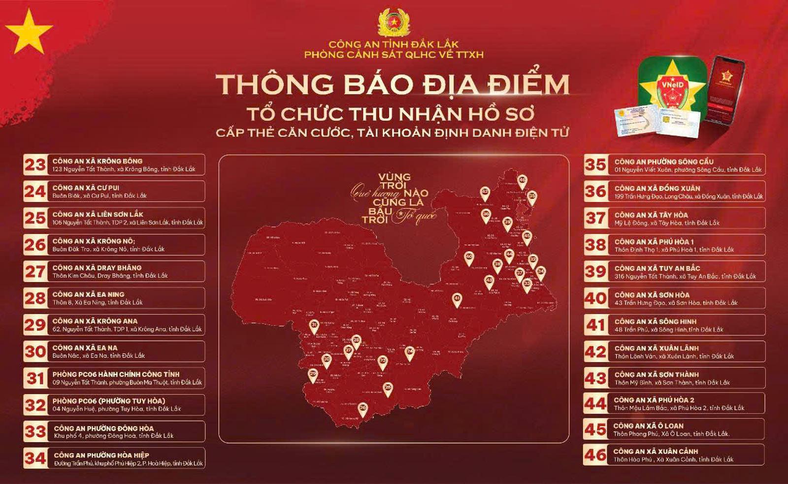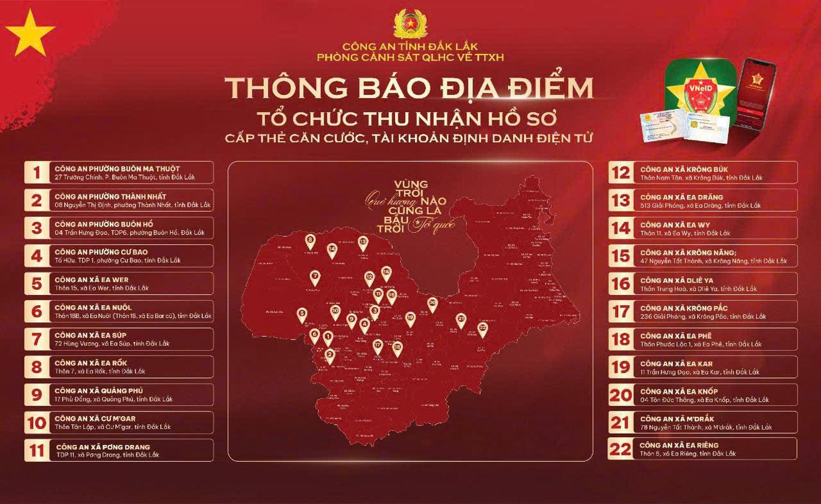 Công an tỉnh Đắk Lắk thông báo các địa điểm tổ chức thu nhận hồ sơ cấp thẻ căn cước, tài khoản định danh điện tử trên địa bàn tỉnh. Ảnh: CA