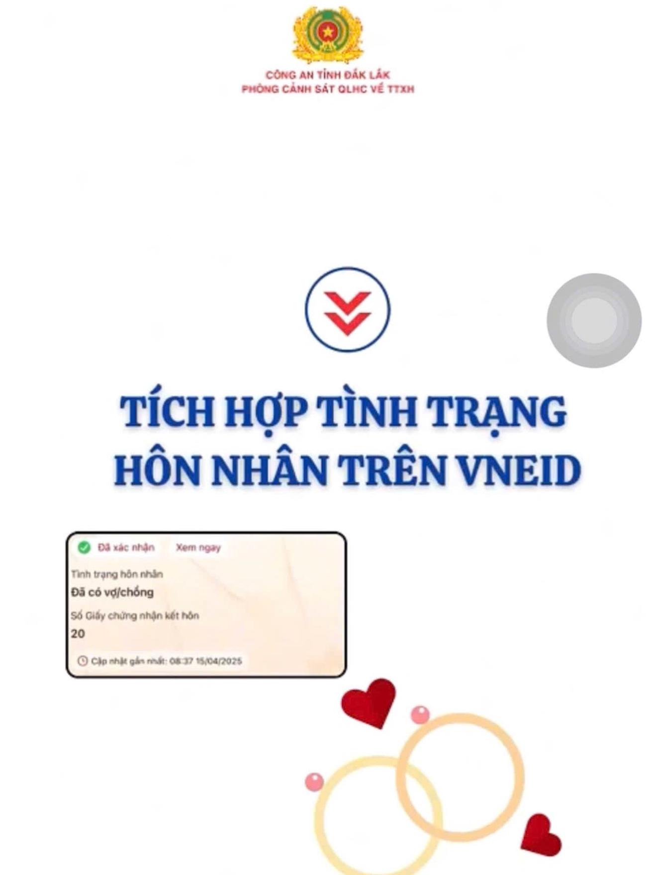 Công an tỉnh Đắk Lắk khuyến khích người dân kiểm tra và cập nhật tình trạng hôn nhân trên ứng dụng VNeID để đảm bảo dữ liệu chính xác. Ảnh: CA