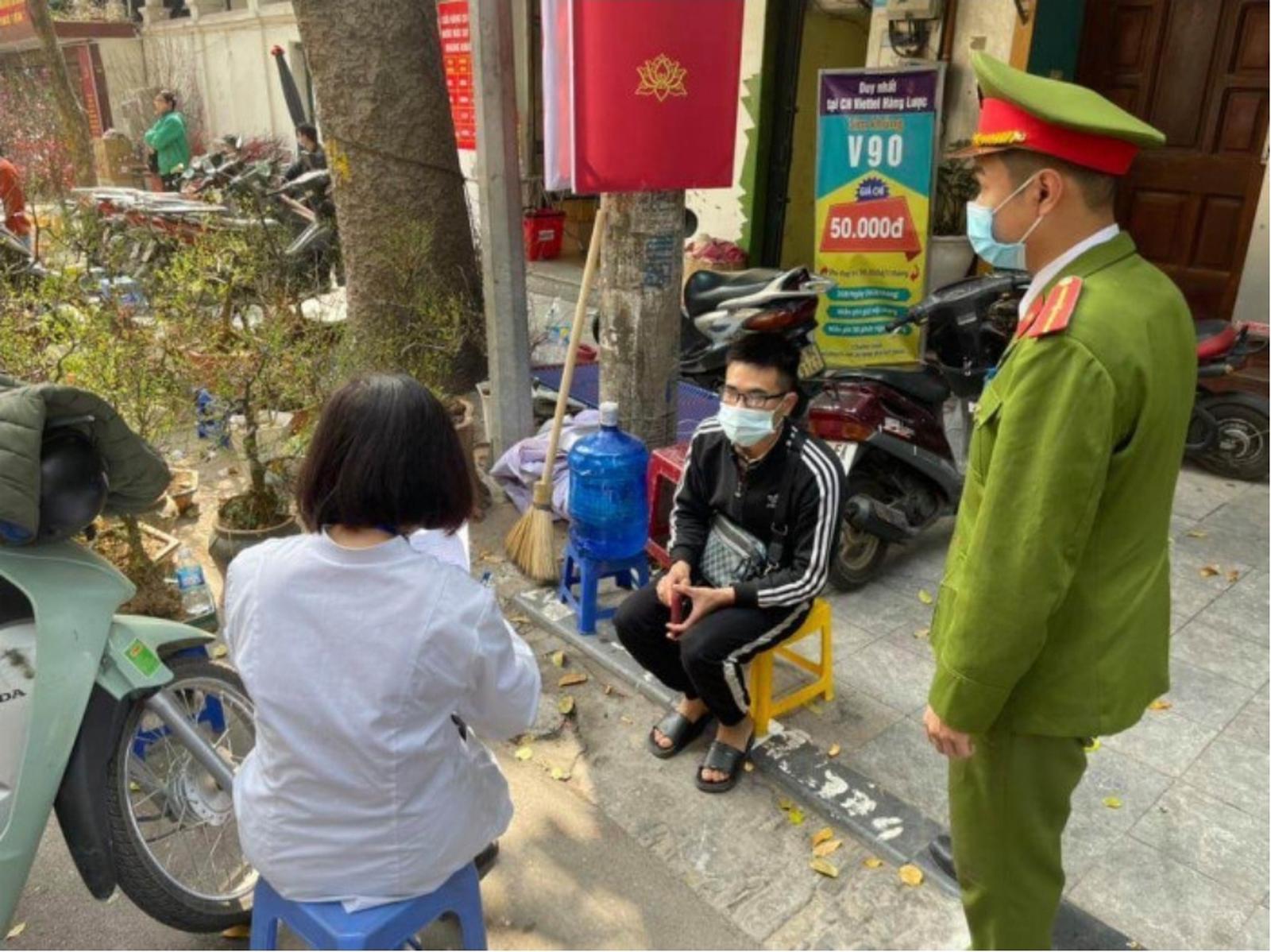 Công an quận Hoàn Kiếm kết hợp cùng cán bộ y tế xử phạt trường hợp không đeo khẩu trang nơi công cộng