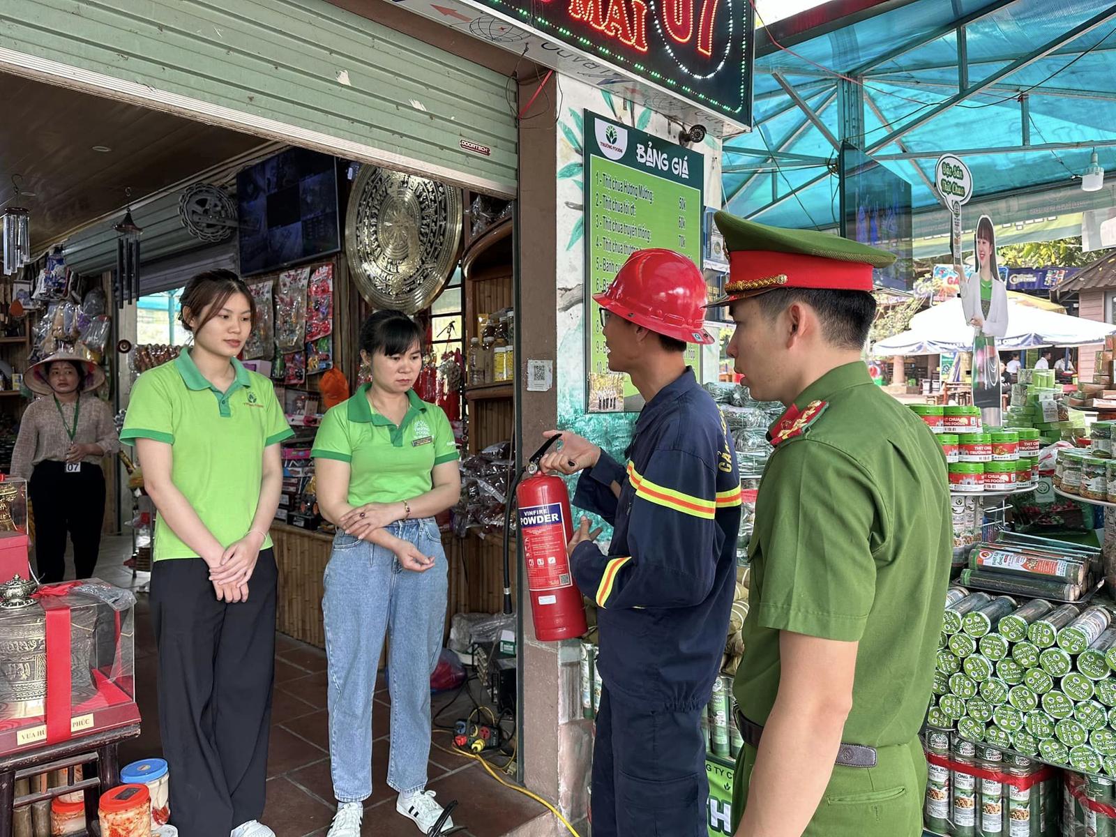 Tuyên truyền, hướng dẫn về công tác PCCC cho các cửa hàng kinh doanh trong khu vực Đền Hùng. Ảnh: ND