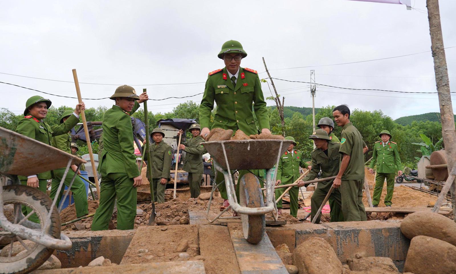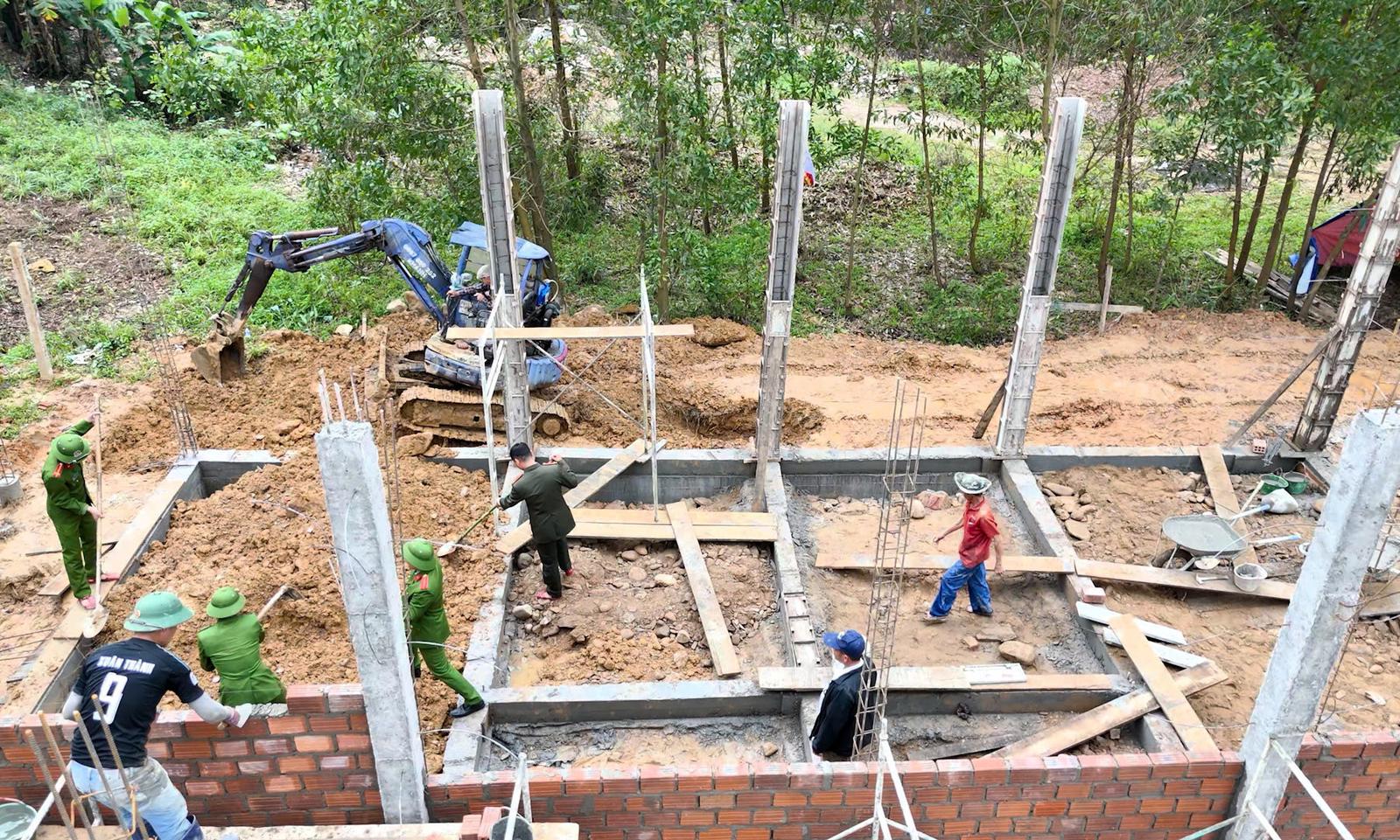 Cán bộ, chiến sĩ Công an TP Huế vượt mưa rét, bám công trường, đẩy nhanh tiến độ thi công nhà ở cho các hộ dân bị thiệt hại do thiên tai. Ảnh: CATP Huế