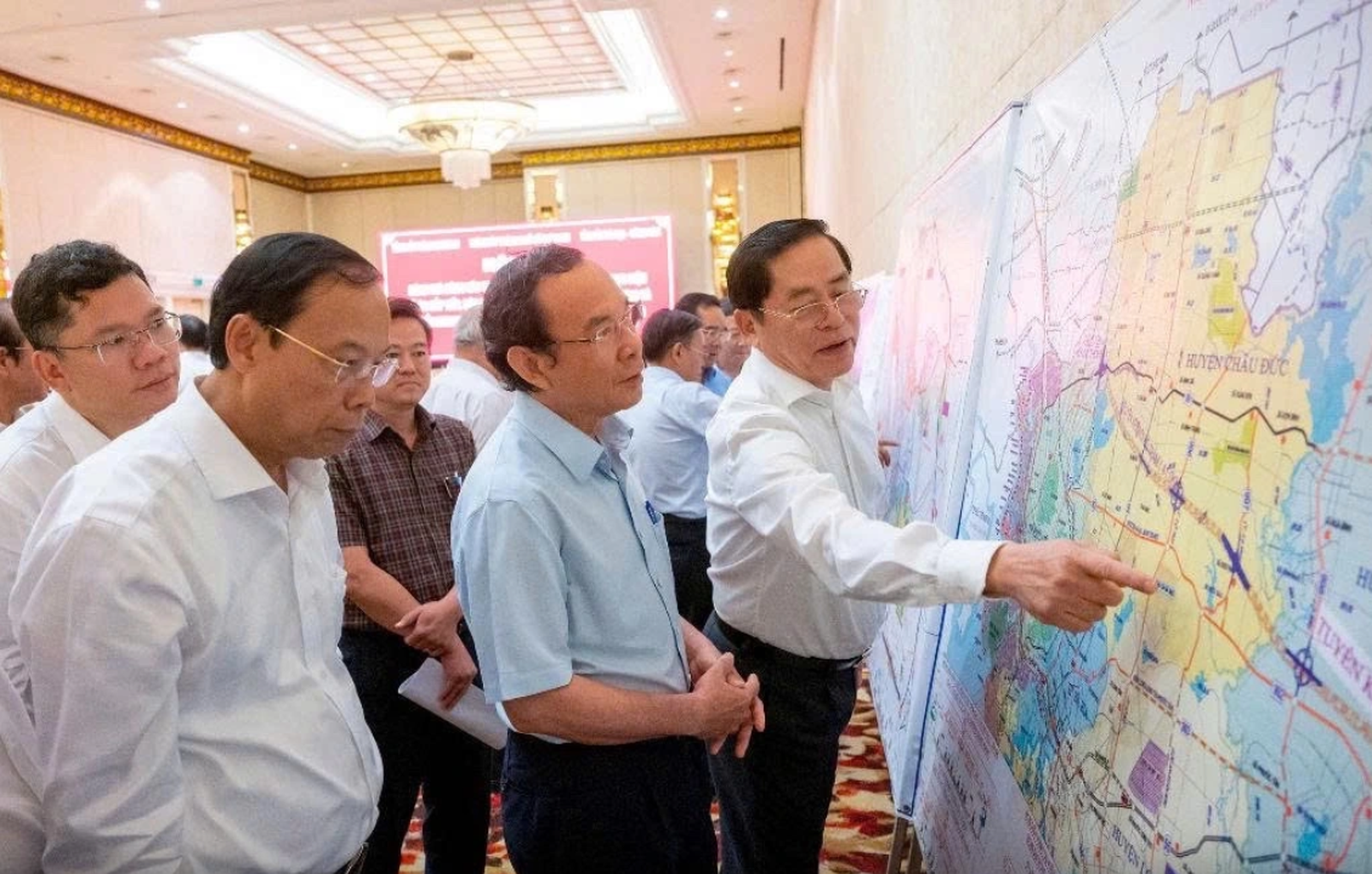 Ông Phạm Viết Thanh, Bí thư Tỉnh ủy Bà Rịa - Vũng Tàu giới thiệu bản đồ tuyến cao tốc đô thị Hồ Tràm - Cảng Hàng không quốc tế Long Thành với ông Nguyễn Văn Nên, Ủy viên Bộ Chính trị, Bí thư Thành ủy TP Hồ Chí Minh. Ảnh: TN