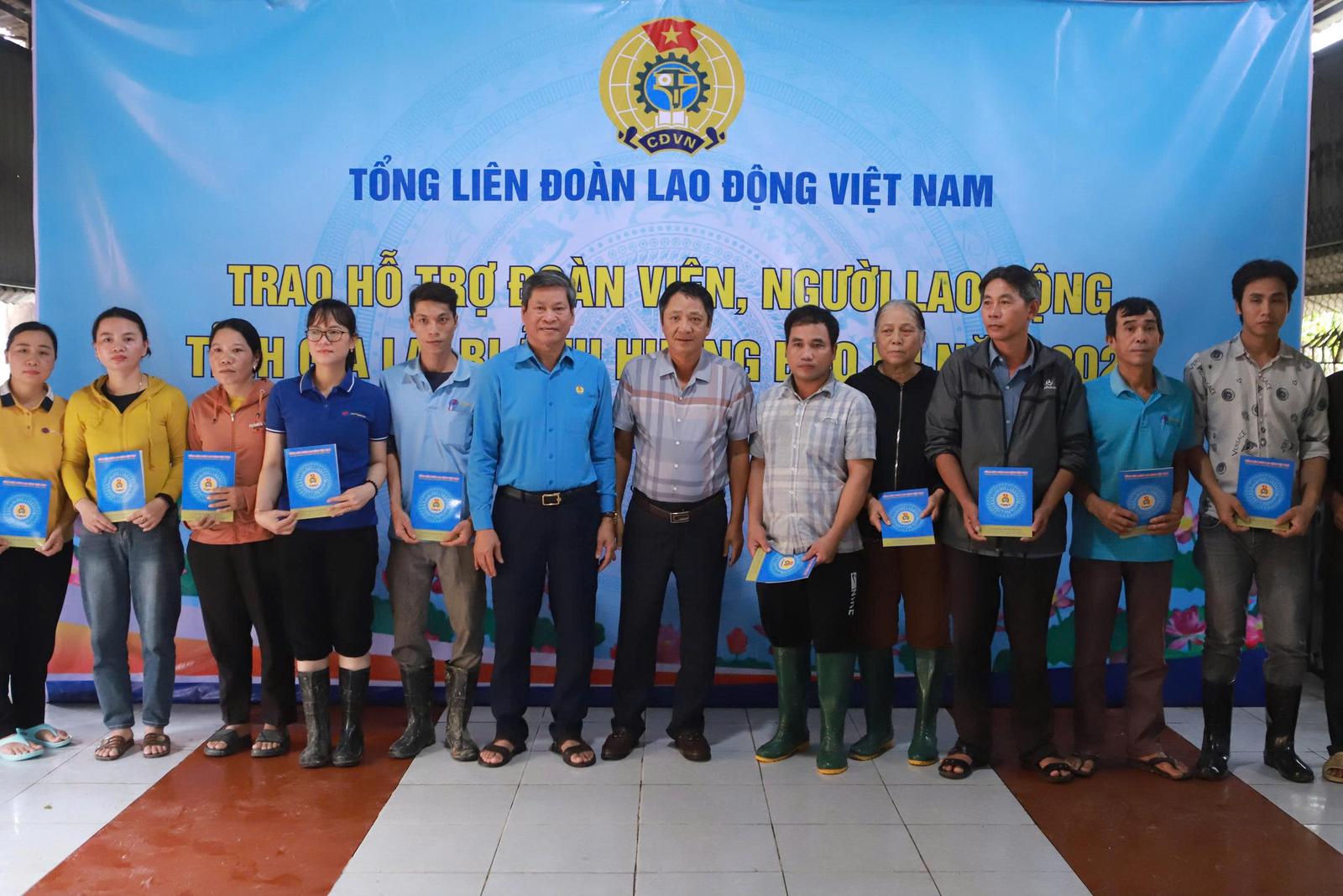 Phó Chủ tịch Tổng LĐLĐ Việt Nam Huỳnh Thanh Xuân trao hỗ trợ cho đoàn viên, người lao động bị thiệt hại do bão lũ. Ảnh: Hoài Phương