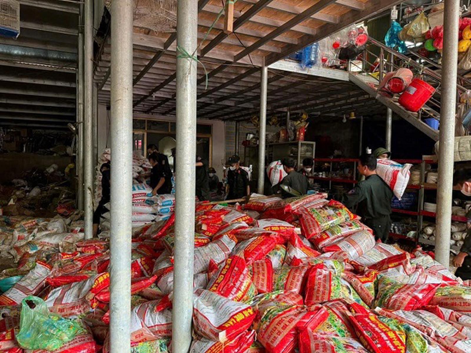 Nước nhấn chìm hơn 300 tấn phân đạm và thức ăn chăn nuôi khiến hộ kinh doanh bà Nguyễn Thị Hằng, xã Tân Lĩnh, huyện Lục Yên mất hơn 3 tỷ đồng. Ảnh: Bùi Bình