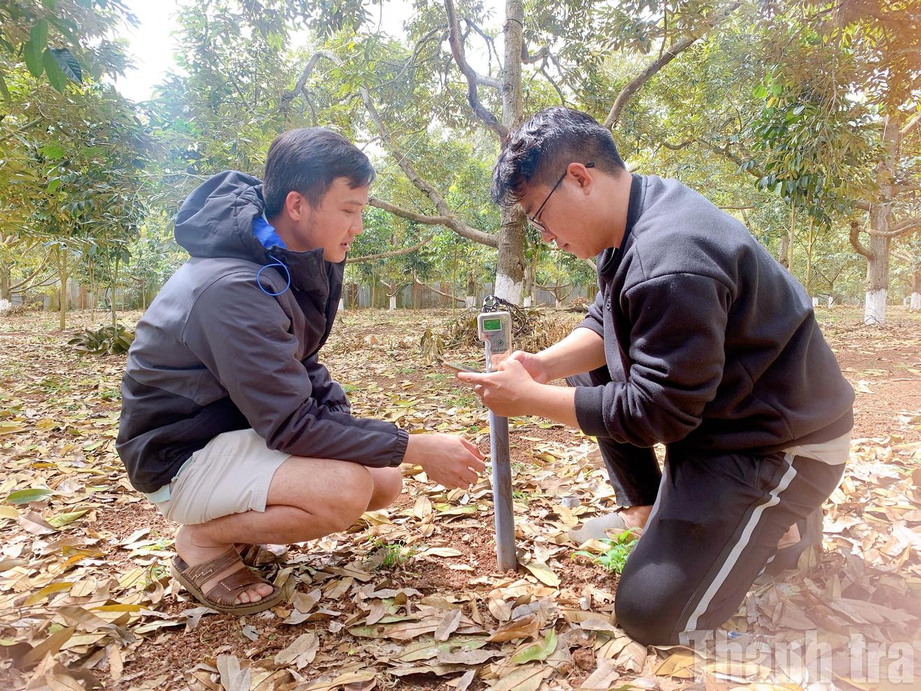 Các xã viên của HTX Nông nghiệp xanh (xã Krông Pắc, Đắk Lắk) áp dụng mô hình tưới thông minh phục vụ canh tác cây sầu riêng bền vững. Ảnh: NG