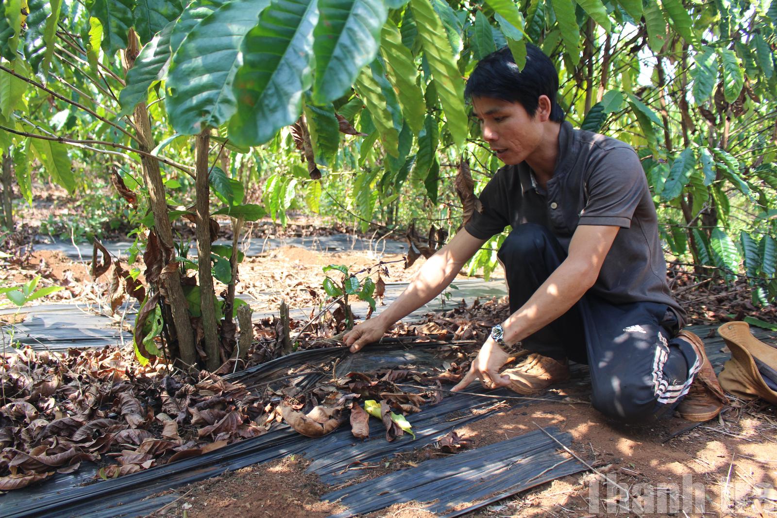 Nông dân trồng cà phê tại Đắk Lắk áp dụng tưới nước tiết kiệm và các biện pháp giữ ẩm đất, góp phần đảm bảo cây trồng phát triển bền vững vào thời kỳ cao điểm mùa khô. Ảnh: NG