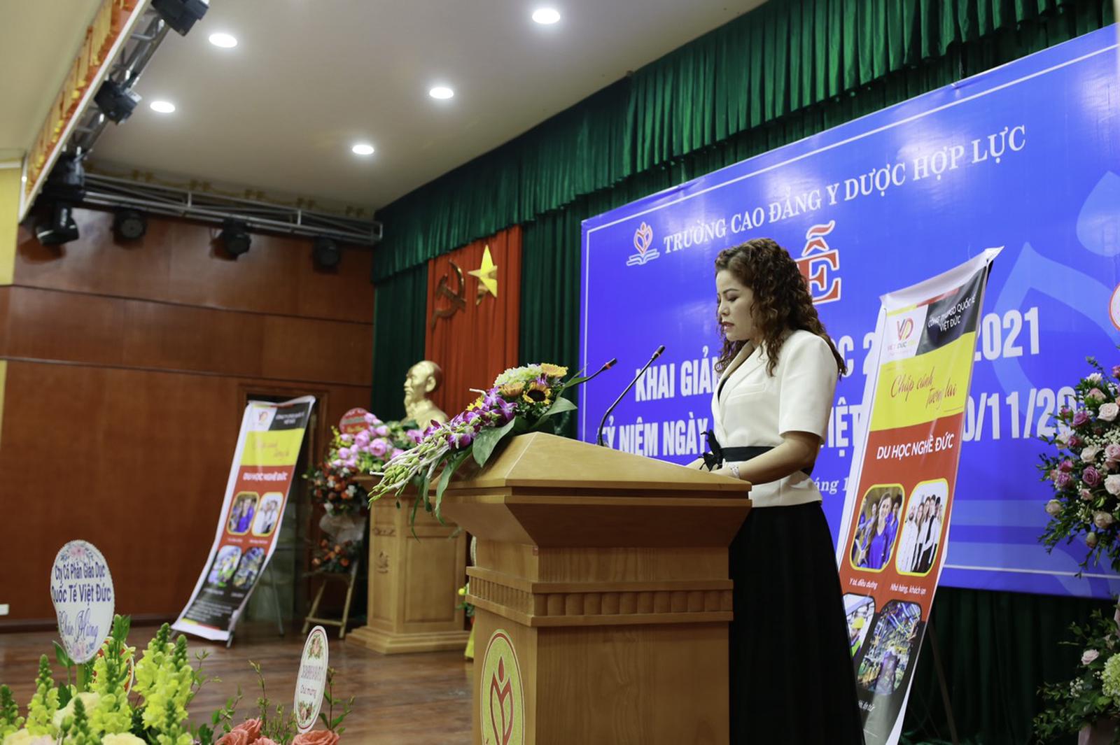Bà Bùi Thị Thu Hà, Chủ tịch Hội đồng Quản trị Công ty Cổ phần Giáo dục Quốc tế Việt Đức phát biểu tại buổi trao học bổng. Ảnh: VT