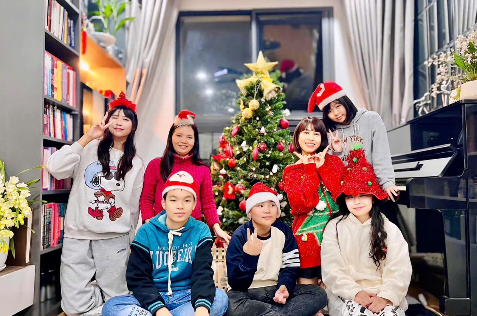 Gia đình chị Nga chụp ảnh cùng nhau bên cây thông Noel. Ảnh: T.Tuấn