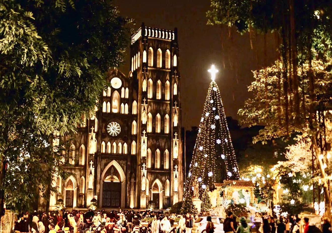 Khu vực xung quanh Nhà thờ Lớn, 40 phố Nhà Chung, Hà Nội được trang hoàng lộng lẫy, tỏa sáng rực rỡ về đêm, thu hút đông đảo khách từ trẻ đến lớn đến vui chơi và cùng nhau chụp những bức ảnh để lưu lại kỷ niệm.
