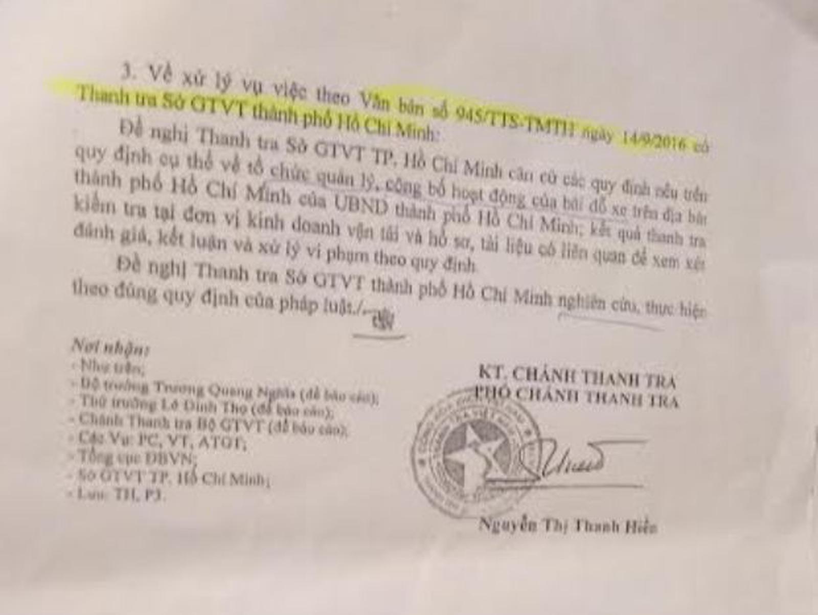Thanh tra Bộ đề nghị Thanh tra Sở GTVT TP HCM căn cứ vào các quy định cụ thể của pháp luật về tổ chức quản lý, công bố hoạt động của bãi đỗ xe trên địa bàn TP HCM, dựa vào kết quả thanh tra, kiểm tra tại các đơn vị kinh doanh vận tải và hồ sơ, tài liệu có liên quan để xem xét, đánh giá, kết luận và xử lý theo quy định.