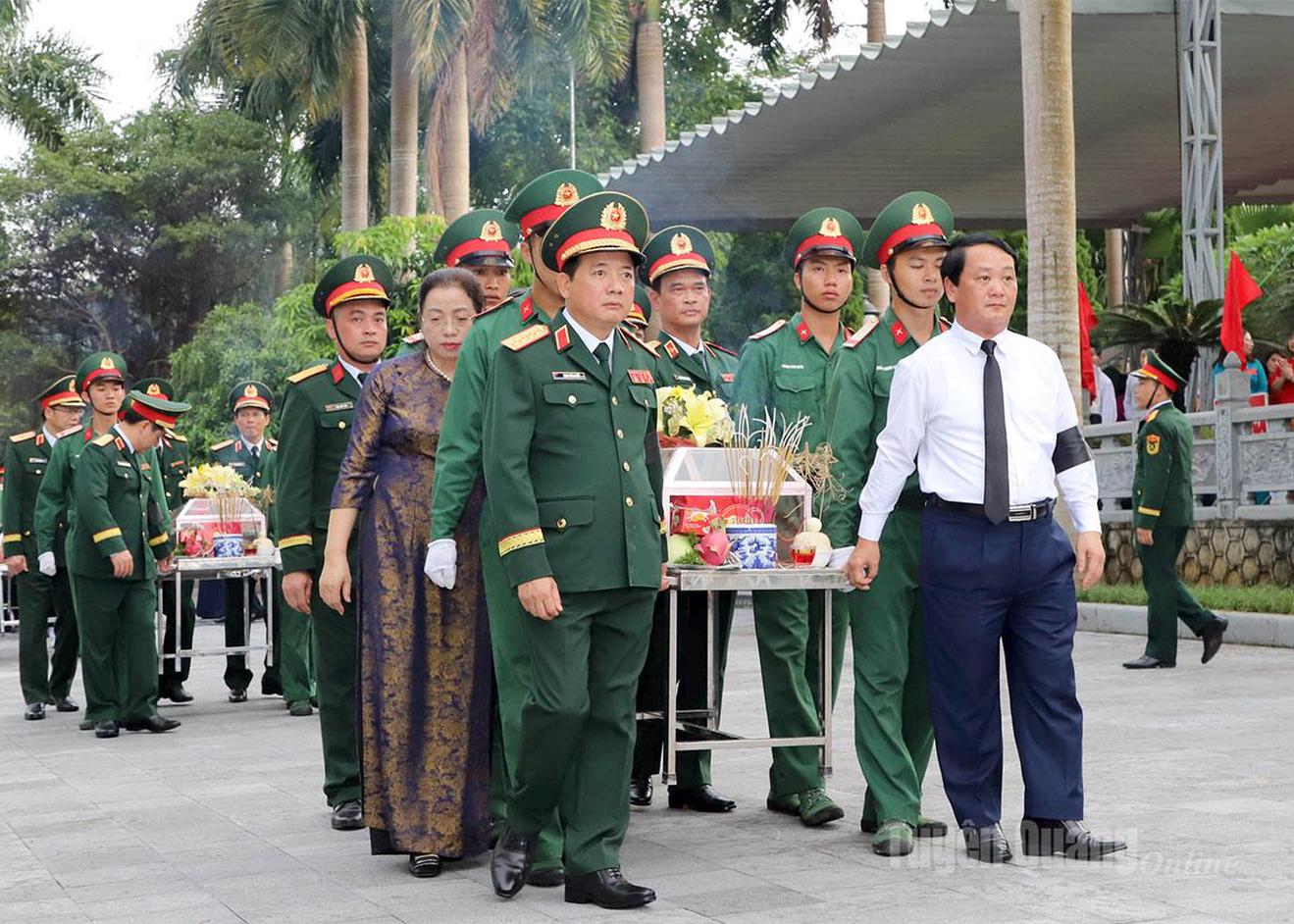 Trong tiếng nhạc du dương, lời bài hát xúc động của ca khúc “Đón các anh về”, các đại biểu đã thực hiện nghi thức di chuyển hài cốt các Anh hùng liệt sĩ về an táng tại Nghĩa trang Liệt sĩ Quốc gia Vị Xuyên và thắp hương lên các phần mộ các Anh hùng liệt sĩ vừa được quy tập, an táng.