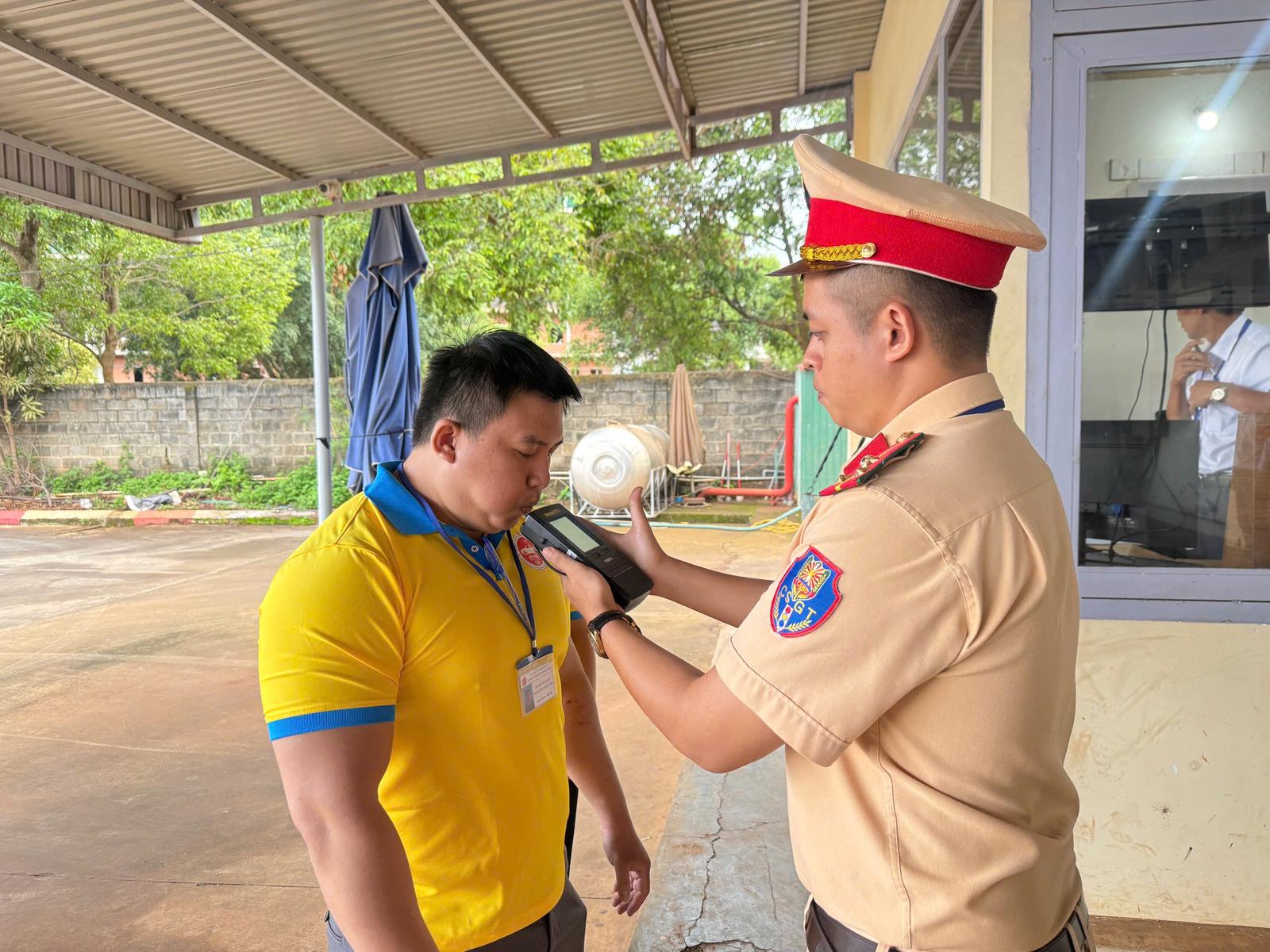 Lực lượng Cảnh sát giao thông tiến hành kiểm tra nồng độ cồn đối với tất cả học viên. Ảnh: CA