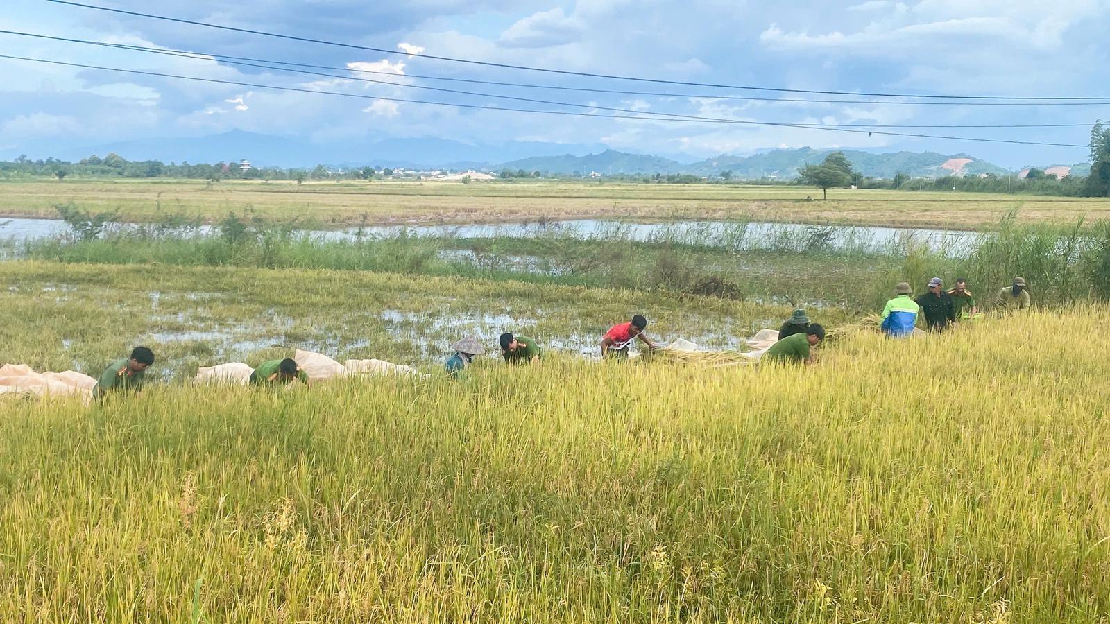 Hàng chục cán bộ, chiến sĩ công an và đoàn viên thanh niên xã Ea Na cùng lội nước, khẩn trương thu hoạch lúa giúp người dân. Ảnh: Vân Anh