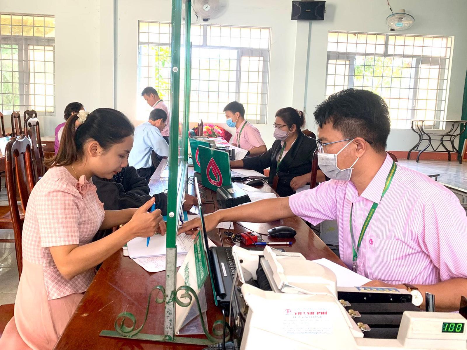 Cán bộ Ngân hàng Chính sách xã hội huyện Krông Bông giải ngân vốn vay tại phiên giao dịch lưu động ở thị trấn Krông Kmar, huyện Krông Bông, Đắk Lắk