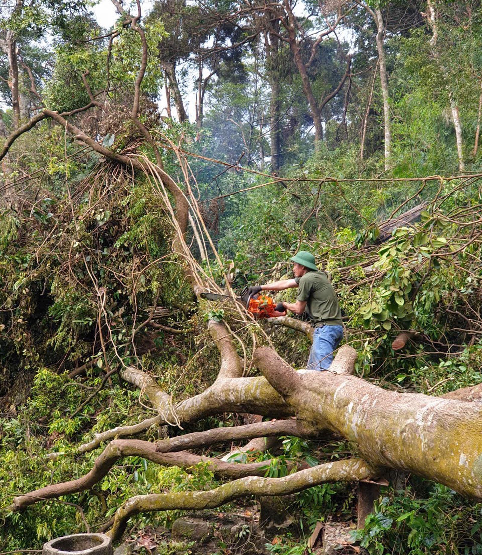 Bão đã đi qua gần chục ngày nhưng hàng chục cán bộ Ban Quản lý di tích và rừng quốc gia Yên Tử vẫn đang cố gắng dọn dẹp, cưa cắt cây xanh đổ bật gốc, tích cực khai thông lối đi cho khách tham quan. Ảnh: Ban Quản lý Di tích Yên Tử