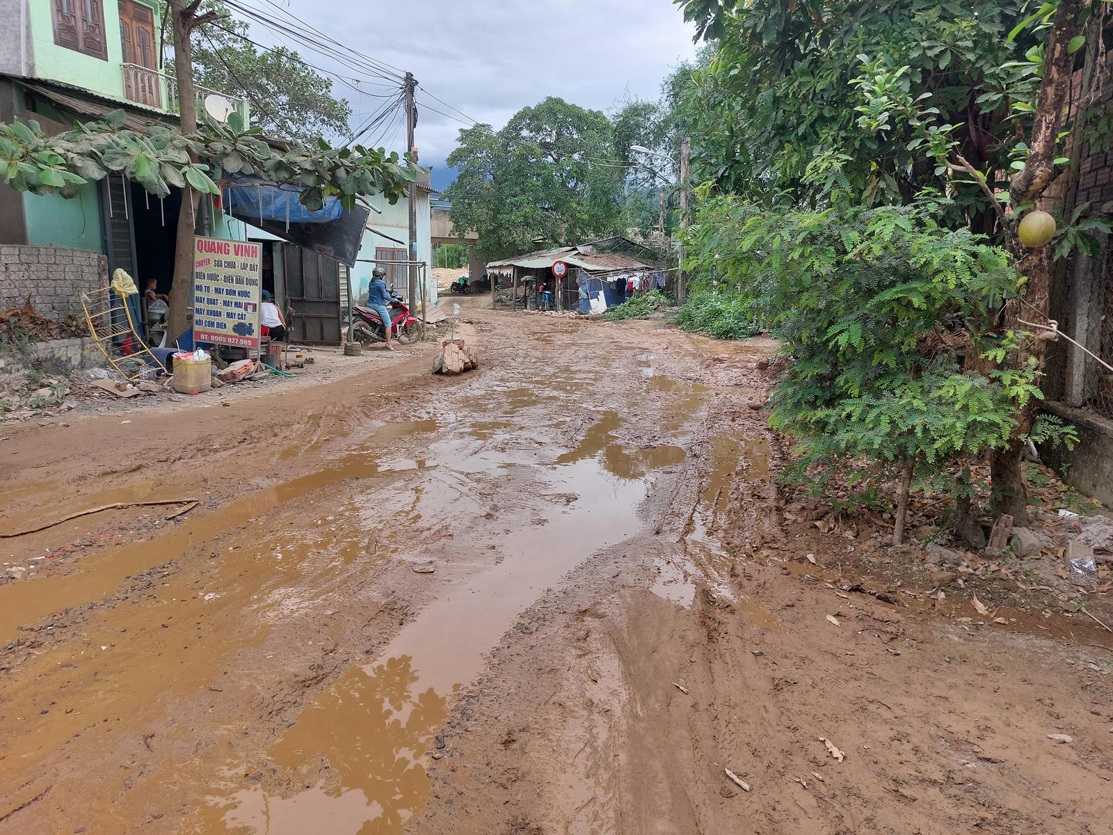 Đường ĐT601 qua các khu dân cư ở Hòa Liên, Hòa Bắc vẫn bụi đất, bùn lầy giữa mùa nắng. Ảnh: N.P