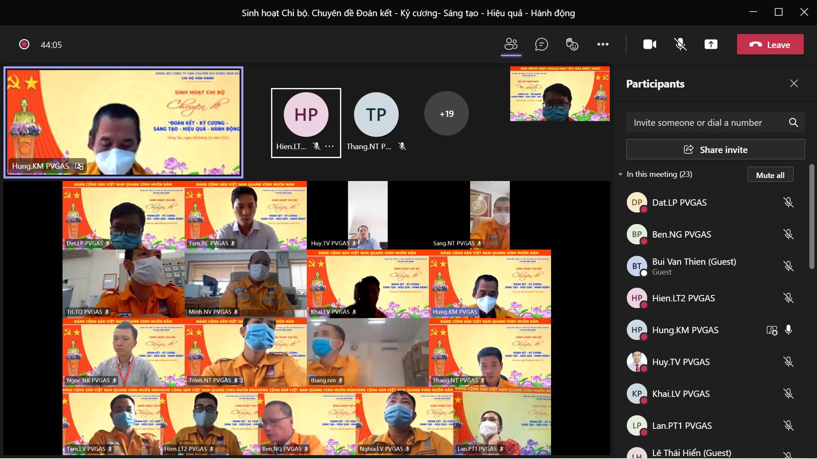 (Thanh tra)- Thực hiện chỉ đạo của Đảng ủy Tập đoàn Dầu khí Quốc gia Việt Nam (PVN), Đảng ủy Tổng Công ty Khí Việt Nam (PVGAS) và Đảng ủy Công ty Vận chuyển Khí Đông Nam Bộ (KĐN), trong tháng 10/2021, 3 chi bộ trực thuộc Đảng bộ KĐN đã hoàn thành công tác tổ chức sinh hoạt về chuyên đề “Đoàn kết - Kỷ cương - Sáng tạo - Hiệu quả - Hành động”, với tinh thần triệt để phòng chống dịch bệnh.