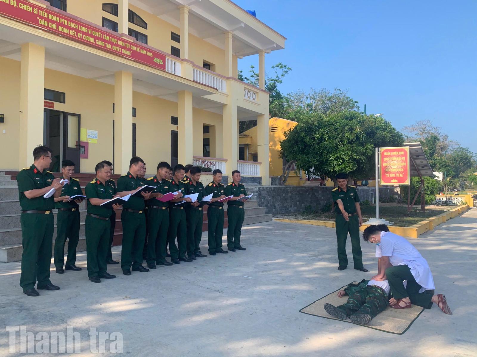 Các y, bác sĩ quân y tập huấn phòng, chống say nóng, say nắng cho bộ đội trên đảo. Ảnh: PV