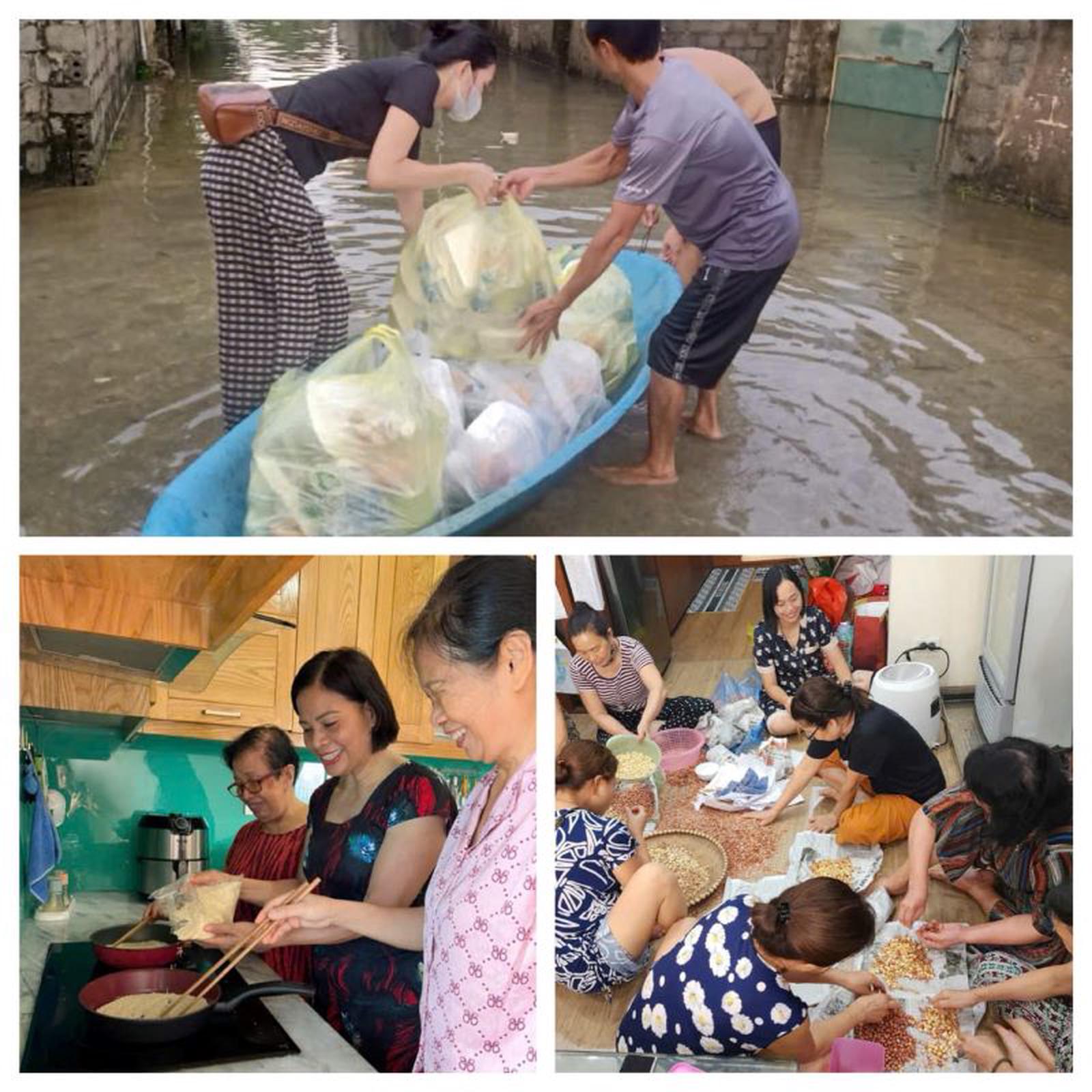 Tại Vinhomes Green Bay Mễ Trì, Nam Từ Liêm, Hà Nội, các cô, các chị hẹn nhau qua phòng cộng đồng của tòa để chuẩn bị suất ăn với mong muốn giúp đỡ được người dân vùng ngập úng. Ảnh: H.N
