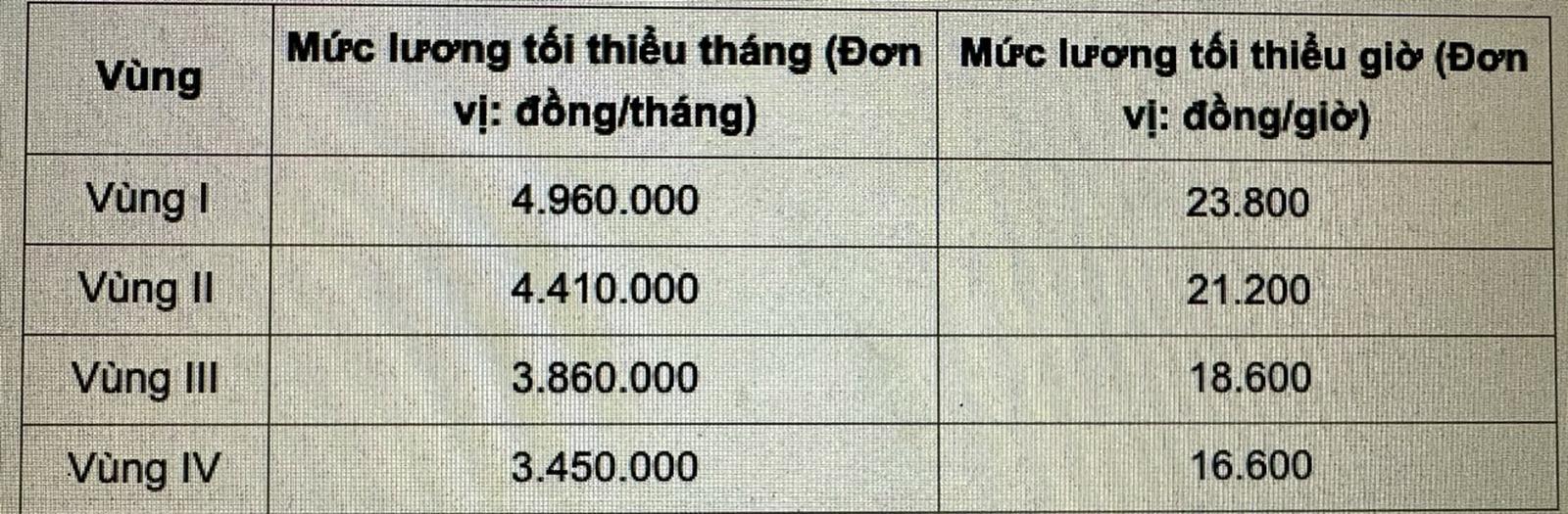 Theo Nghị định 74/2024, mức lương tối thiểu tháng và mức lương tối thiểu giờ đối với người lao động làm việc cho người sử dụng lao động theo vùng như sau: