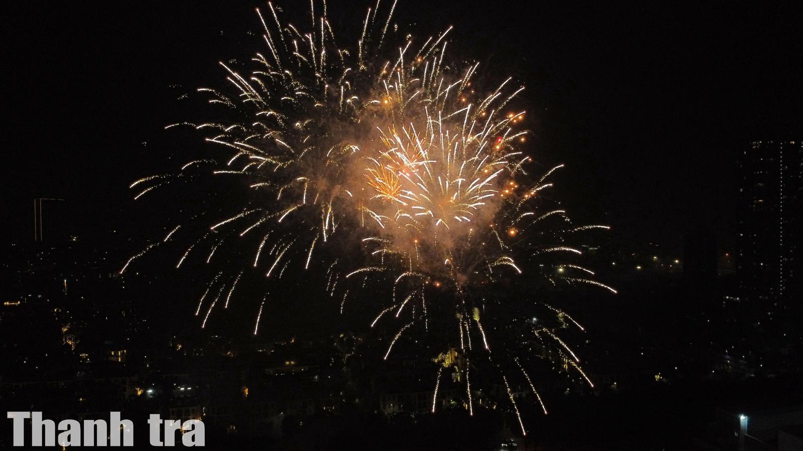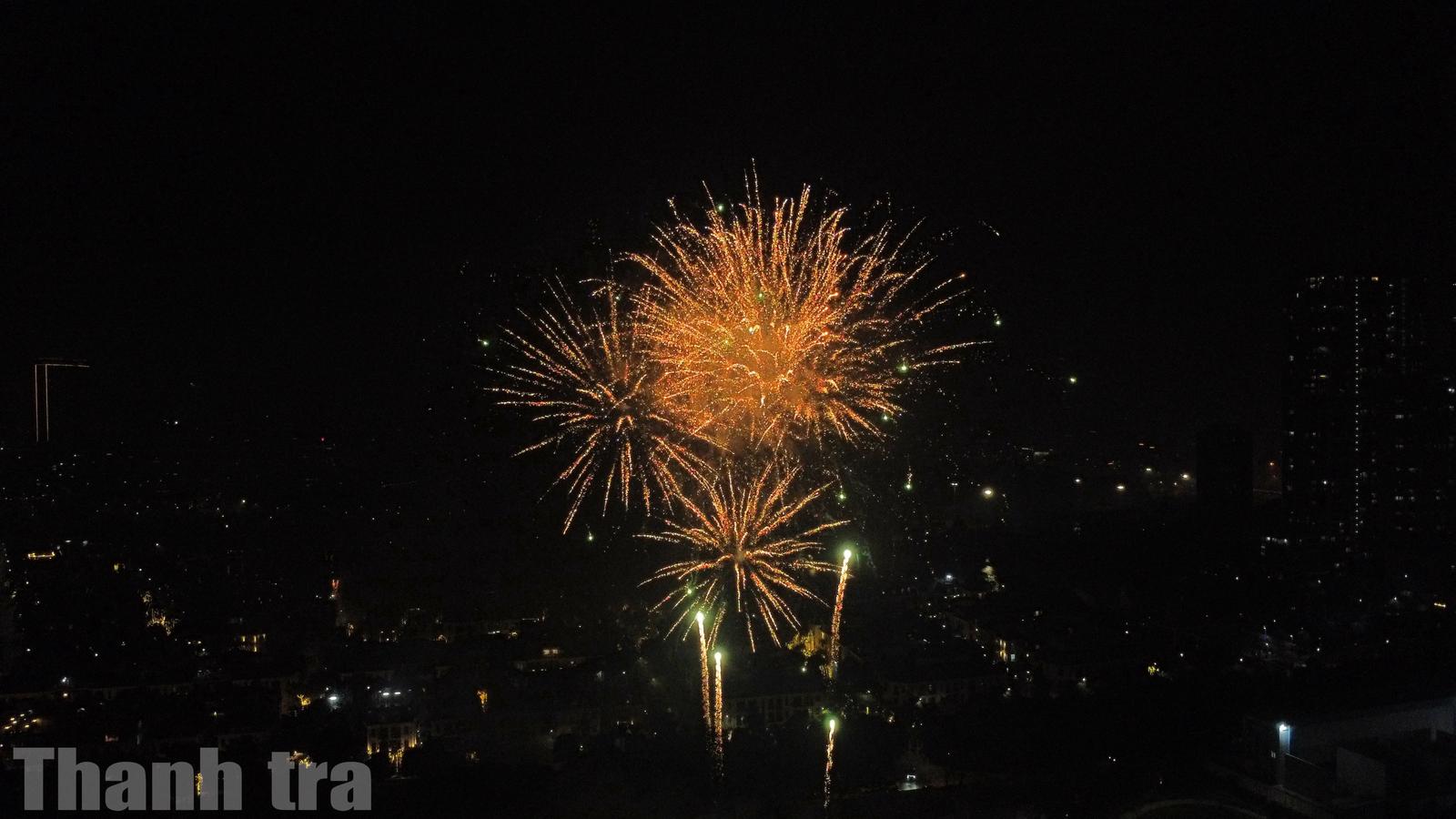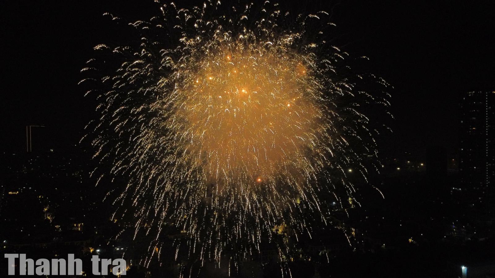 Những chùm pháo hoa vàng rực nở bừng trên bầu trời đêm Hà Nội, tạo nên khoảnh khắc ấn tượng giữa không gian đô thị lung linh ánh sáng. Ảnh: Việt Hà