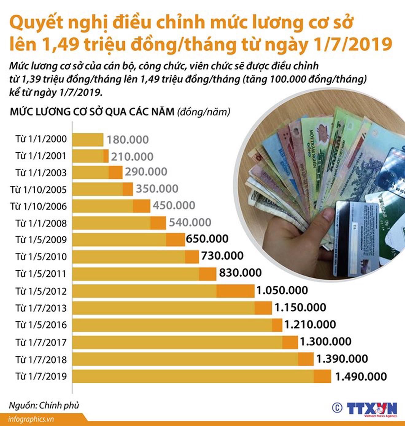Mức lương cơ sở của cán bộ, công chức, viên chức sẽ được điều chỉnh từ 1,39 triệu đồng/tháng lên 1,49 triệu đồng/tháng (tăng 100.000 đồng/tháng) kể từ ngày 1/7/2019./.