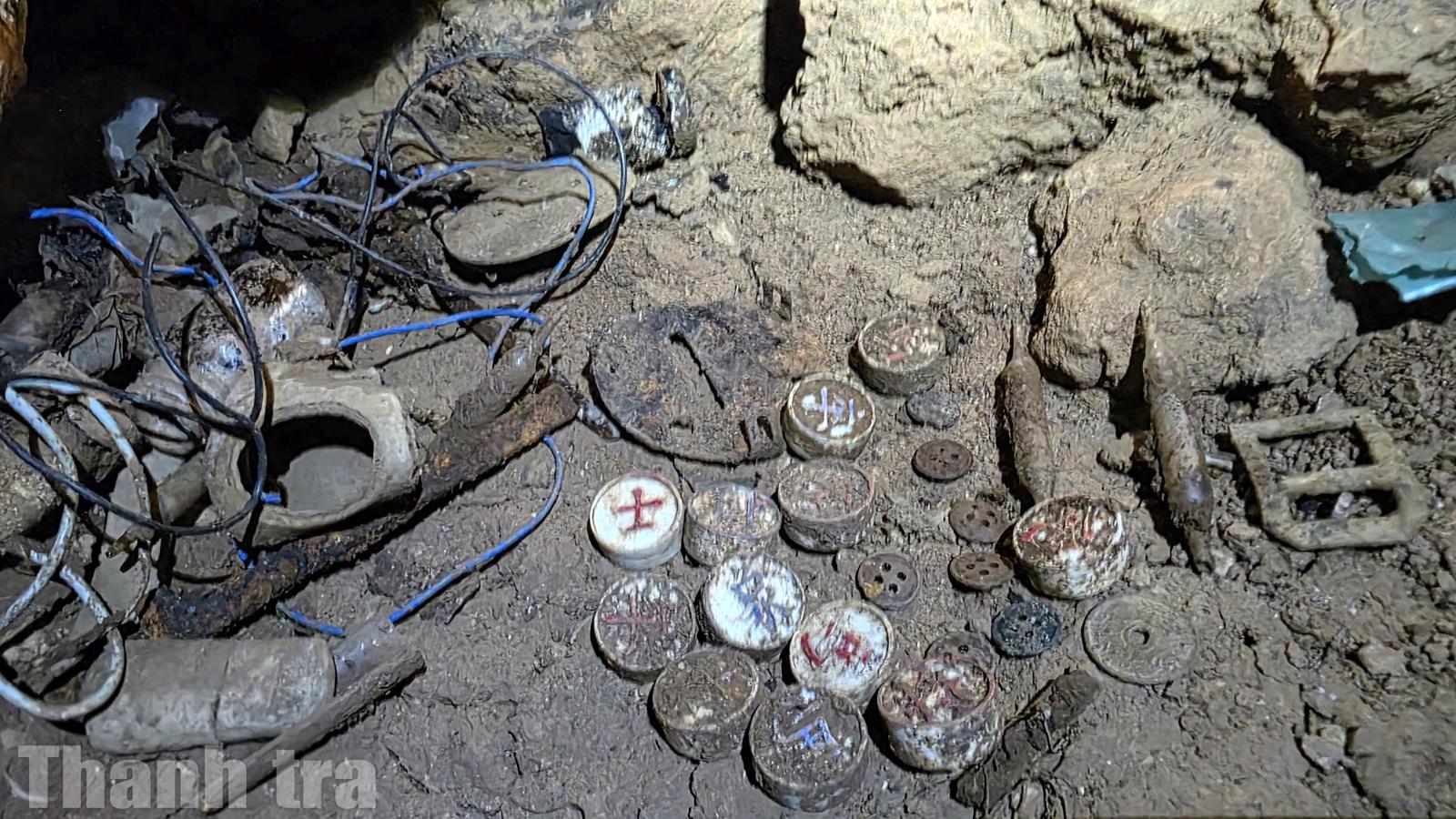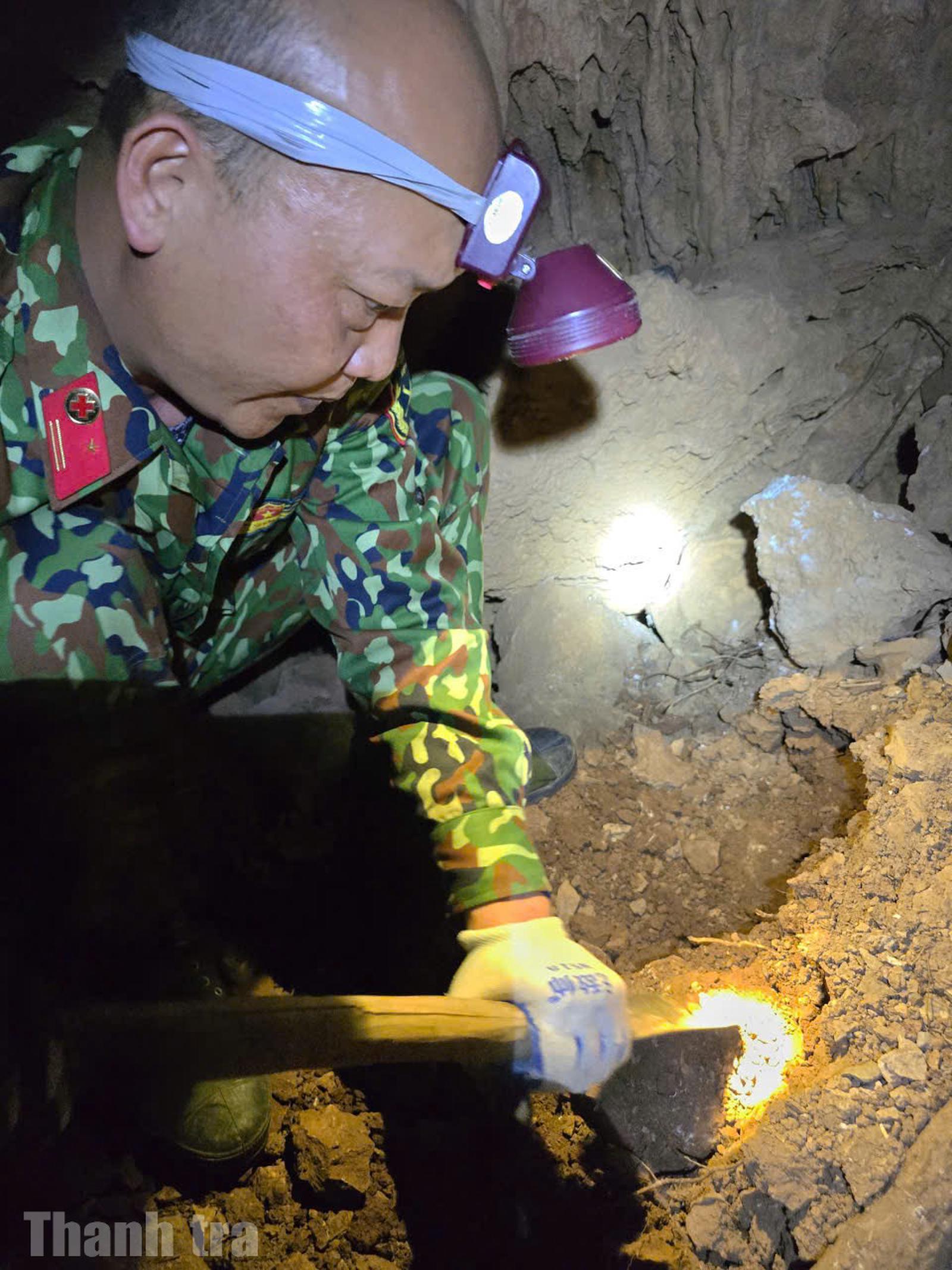Cán bộ, chiến sĩ sử dụng đèn chiếu, kiểm tra tỉ mỉ từng lớp đất trong điều kiện địa hình hang động phức tạp. Ảnh: Minh Tân