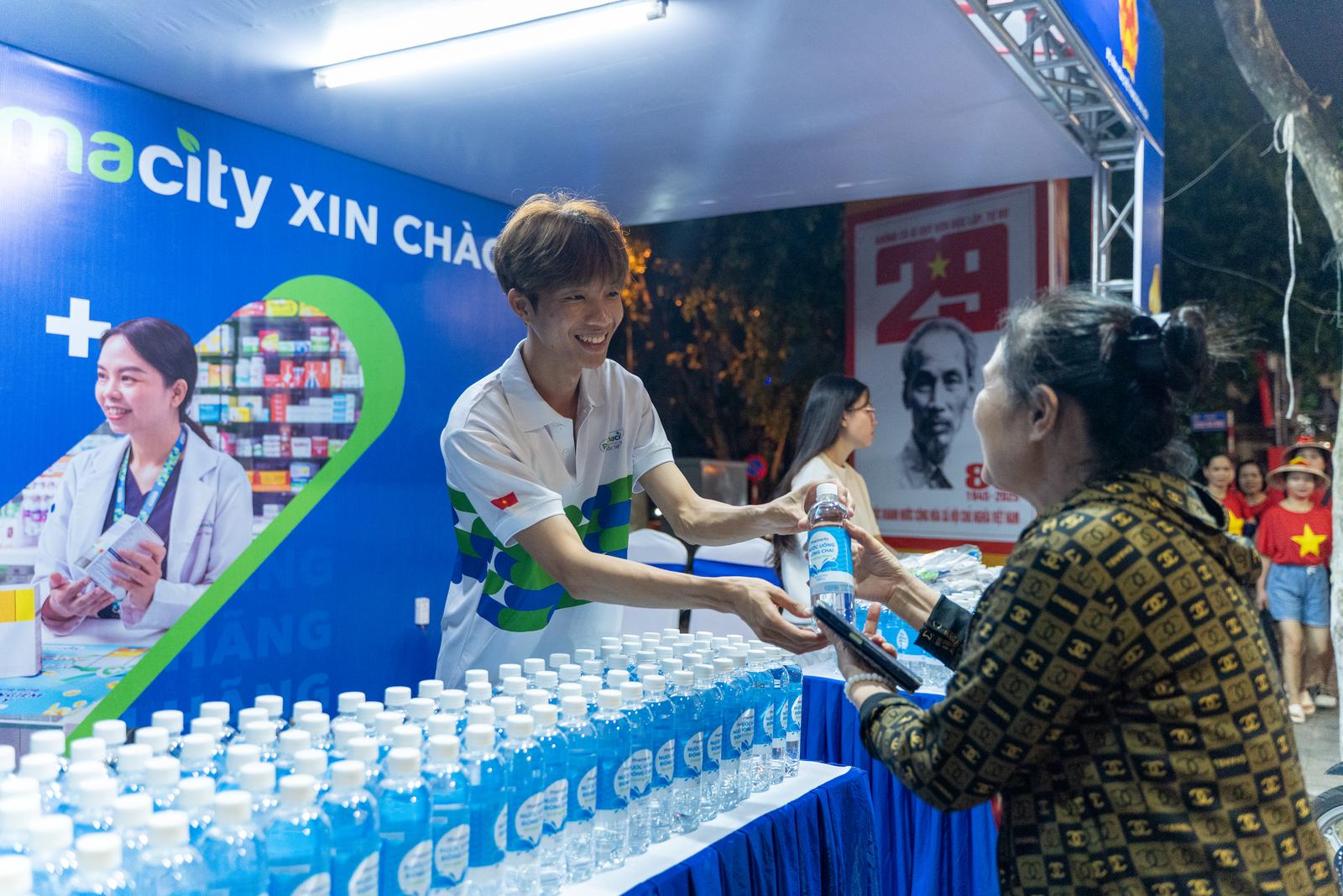 Bên cạnh chuyên môn tại chỗ, các dược sĩ Pharmacity liên tục nhắc mọi người giữ gìn sức khỏe, gửi tặng nước suối đóng chai và quạt mát, đồng thời hướng dẫn người dân đứng ở khu vực râm mát, không chen lấn, bỏ rác đúng nơi quy định