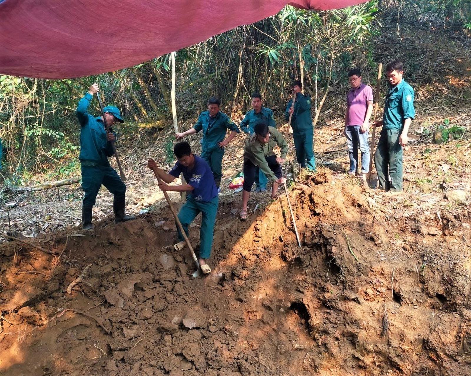 Dân quân xã Mường Pồn tham gia tìm kiếm hài cốt liệt sĩ Nguyễn Văn Dụng tại rừng bản Lĩnh. Ảnh: Nguyễn Hiền