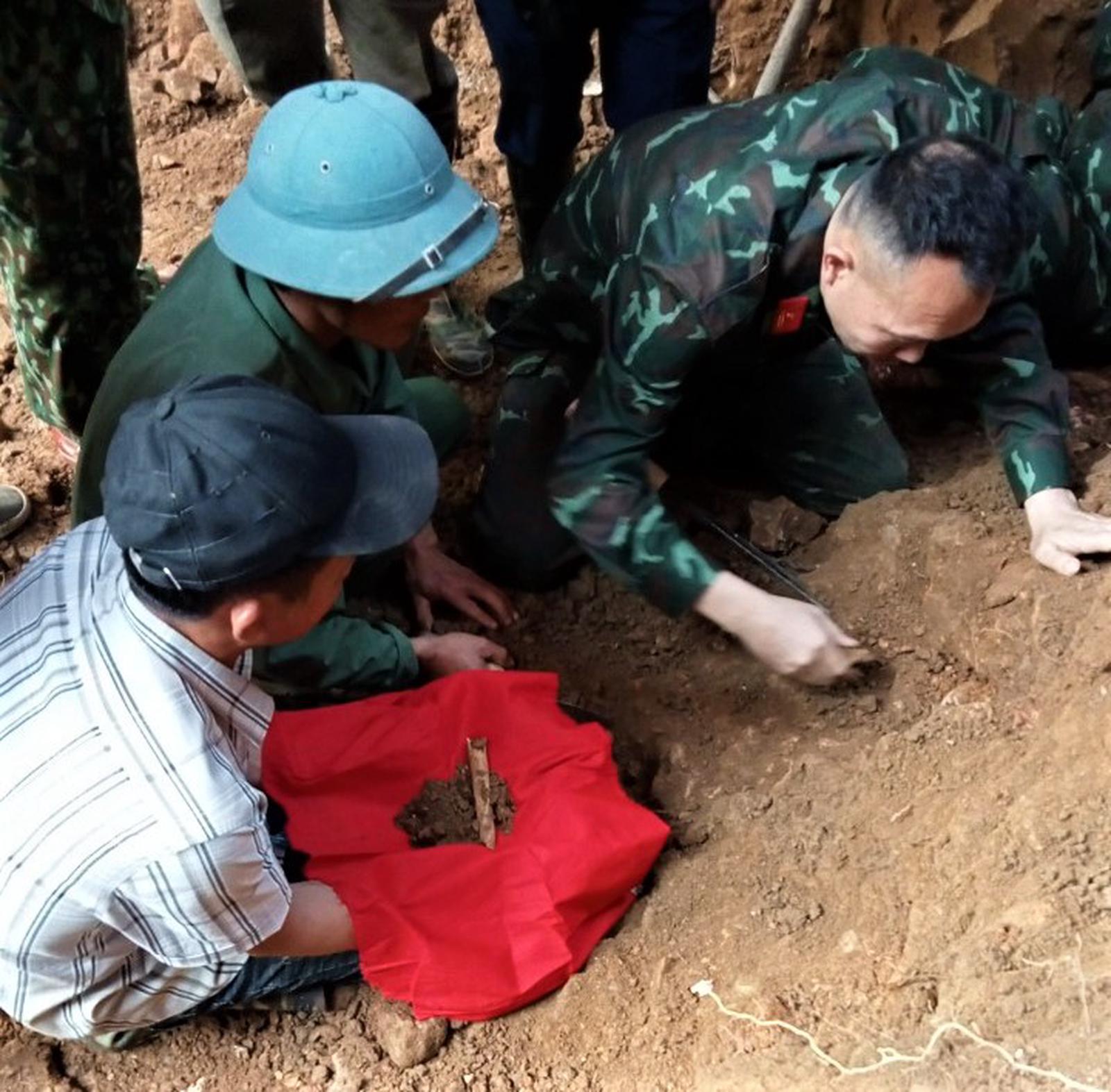 Đến cuối giờ chiều, các lực lượng mới tìm thấy hài cốt liệt sĩ. Ảnh: Nguyễn Hiền