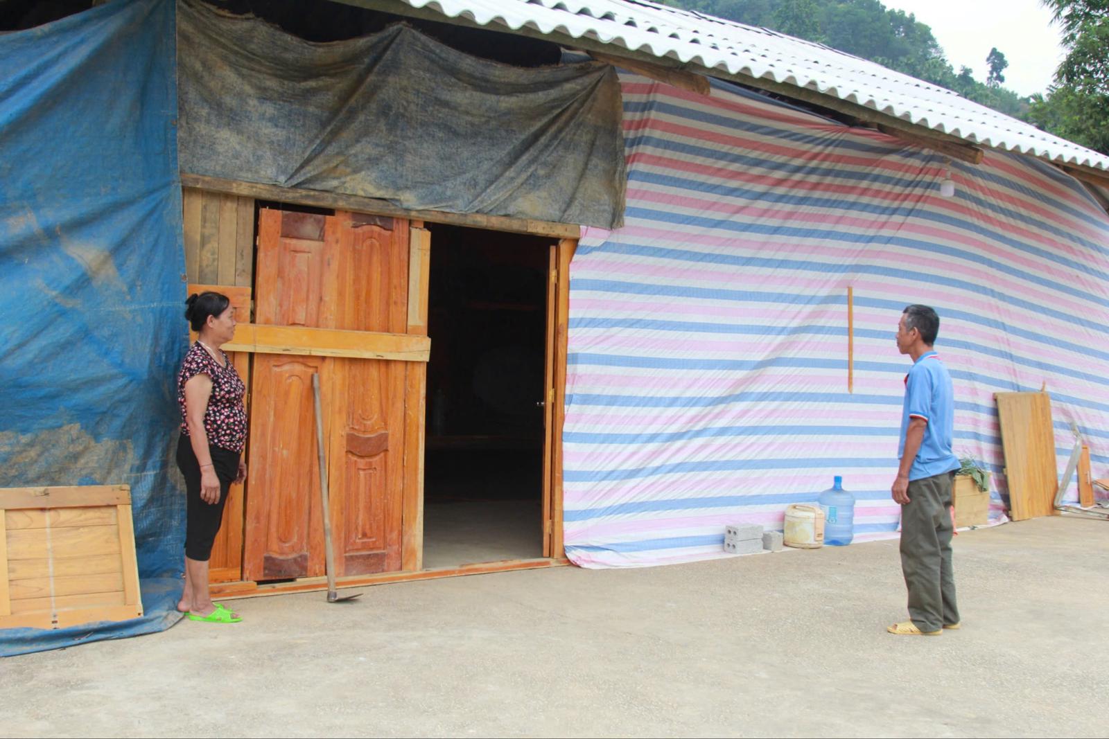 Chỗ ở tạm của gia đình ông Hoàng Văn Quế trong khi chờ xây nhà mới. Ảnh: Bùi Bình