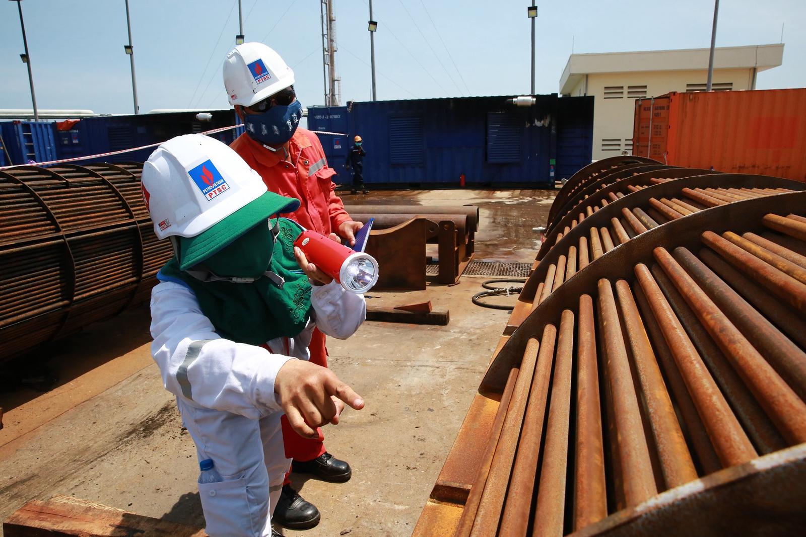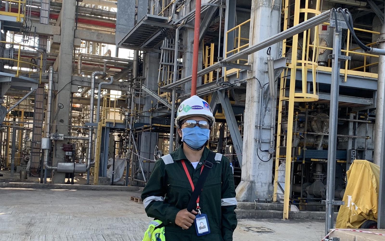 Cũng có con nhỏ như y tá Thu Hà, kỹ sư lọc dầu Nguyễn Thị Tường Vi (PTSC Quảng Ngãi) đang thực hiện nhiệm vụ là điều phối viên các phần việc thuộc gói 4: Làm sạch các thiết bị trao đổi nhiệt. Nhìn chị nhỏ thó trong bộ trang phục bảo hộ, luôn tay ghi chép, phối hợp với nhân sự Thái Lan điều phối công việc trên công trường. Công việc của chị là kiểm tra độ sạch của thiết bị được rửa, kiểm tra độ ăn mòn của thiết bị sau đó làm báo cáo gửi BSR. Để cảm nhận được sự vất vả, tôi hỏi chị: “Những ngày này, chị thường uống bao nhiêu nước?”. Chị Vi nói: “12h làm việc trên công trường, tôi uống hơn 2 lít nước”. Thỉnh thoảng, chị lại đưa tay lên quệt ngang mặt để lau mồ hôi bởi dưới cái nắng gần 40 độ của miền Trung, “sắt thép còn cong vênh” thì con người thật nhỏ bé.