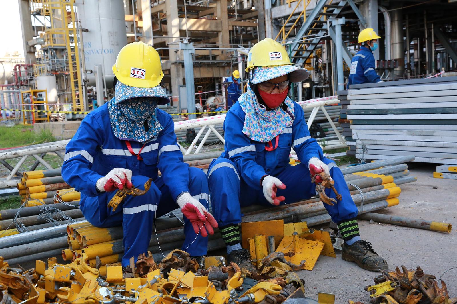 Đó là lời tâm sự của chị Đinh Thị Được (50 tuổi) và chị Nguyễn Thị Bích Thương (41 tuổi) - hai lao động phổ thông trong gói 1. Hai chị được thuê làm các công việc như phân loại lắp cùm của giàn giáo để chuyển lên các tầng cao của phân xưởng RFCC, thu dọn giàn giáo vào nơi tập kết… Chị Được chia sẻ: “Tranh thủ lúc nông nhàn, thấy có công ty tuyển người làm việc ở Nhà máy, tôi xin và được chấp nhận. Công việc ở đây không vất vả bằng nghề nông. Làm nông phải chạy theo thời tiết”.