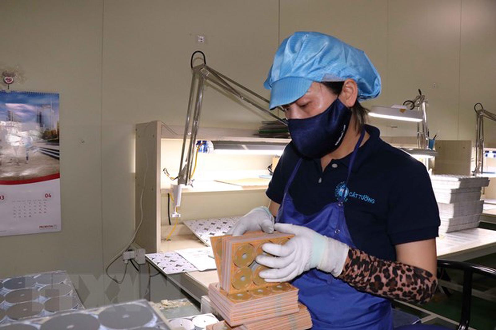 Công nhân sản xuất tại Công ty trách nhiệm hữu hạn sản xuất điện tử Pbc Cát Tường, phường Võ Cường, thành phố Bắc Ninh, tỉnh Bắc Ninh. (Ảnh: Thái Hùng/TTXVN)