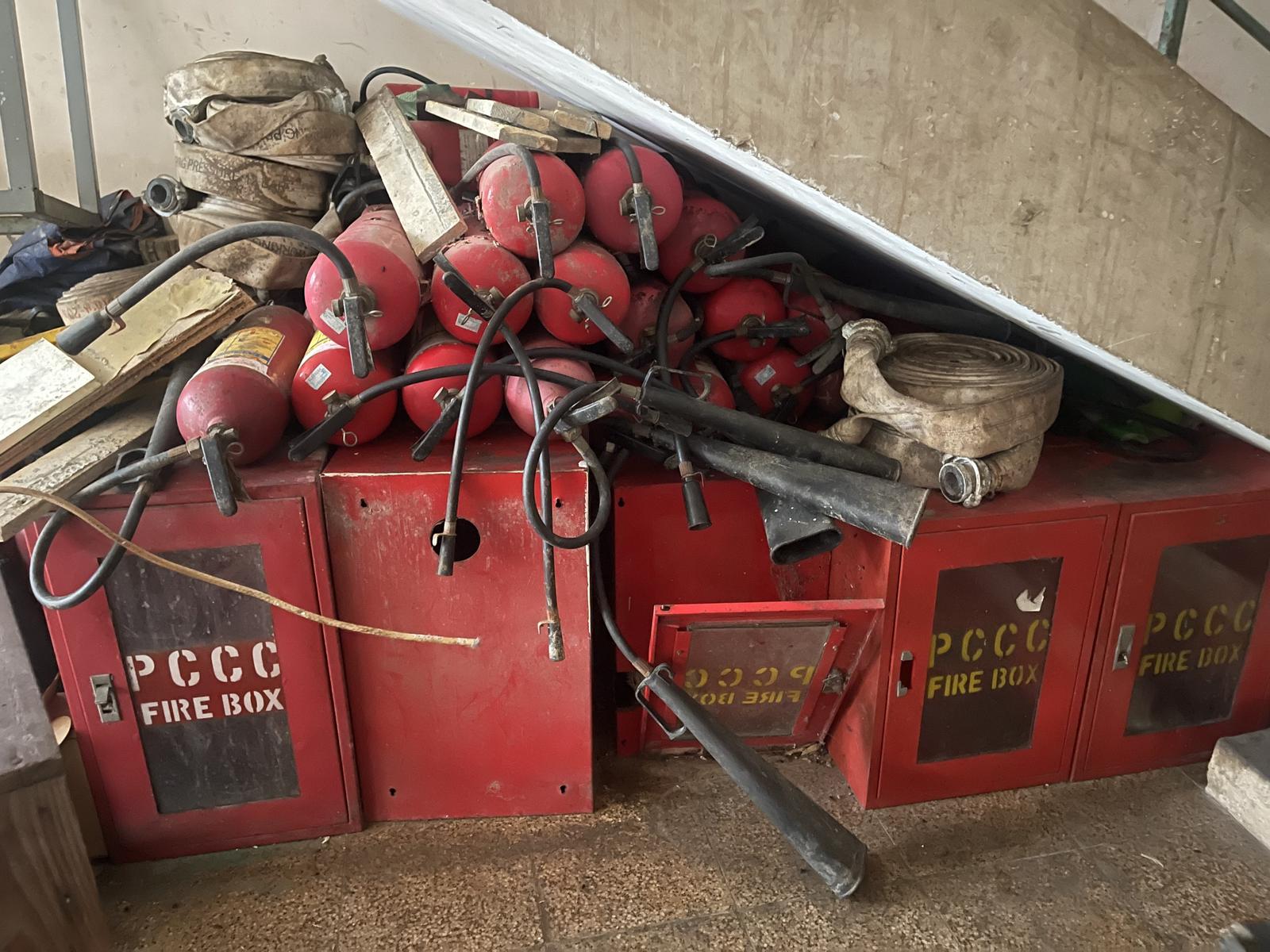 Các thiết bị PCCC hết hạn sử dụng được người dân gom lại để dưới chân cầu thang. Ảnh: Chí Cường.