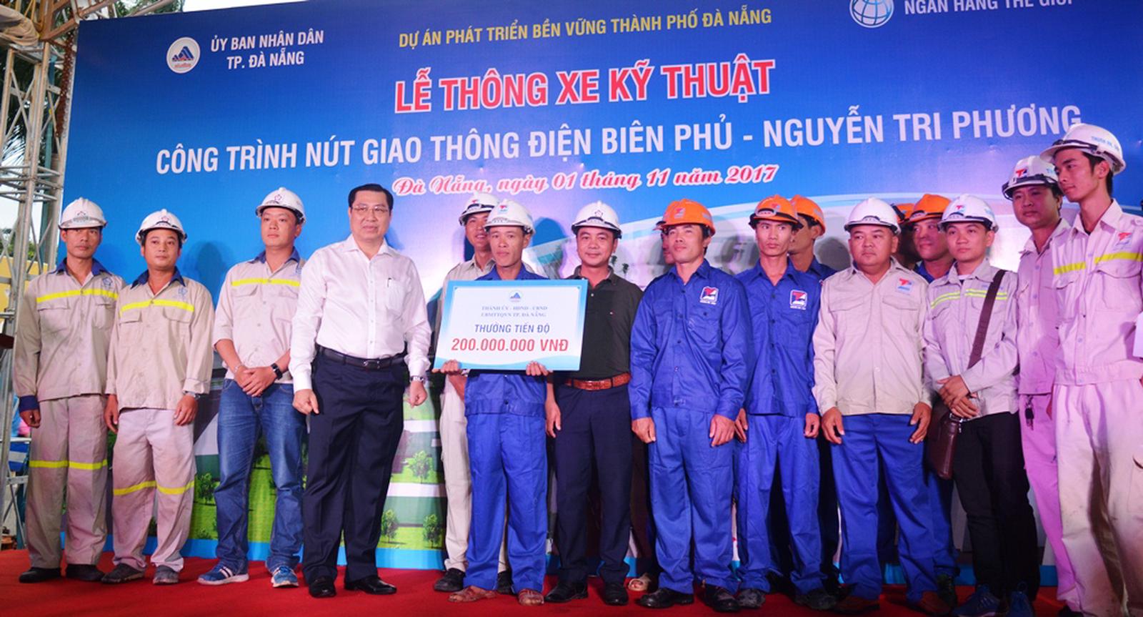 Tại lễ thông xe, Chủ tịch UBND TP Đà Nẵng Huỳnh Đức Thơ đã trao thưởng 200 triệu đồng cho tập thể công nhân thi công trên công trường.